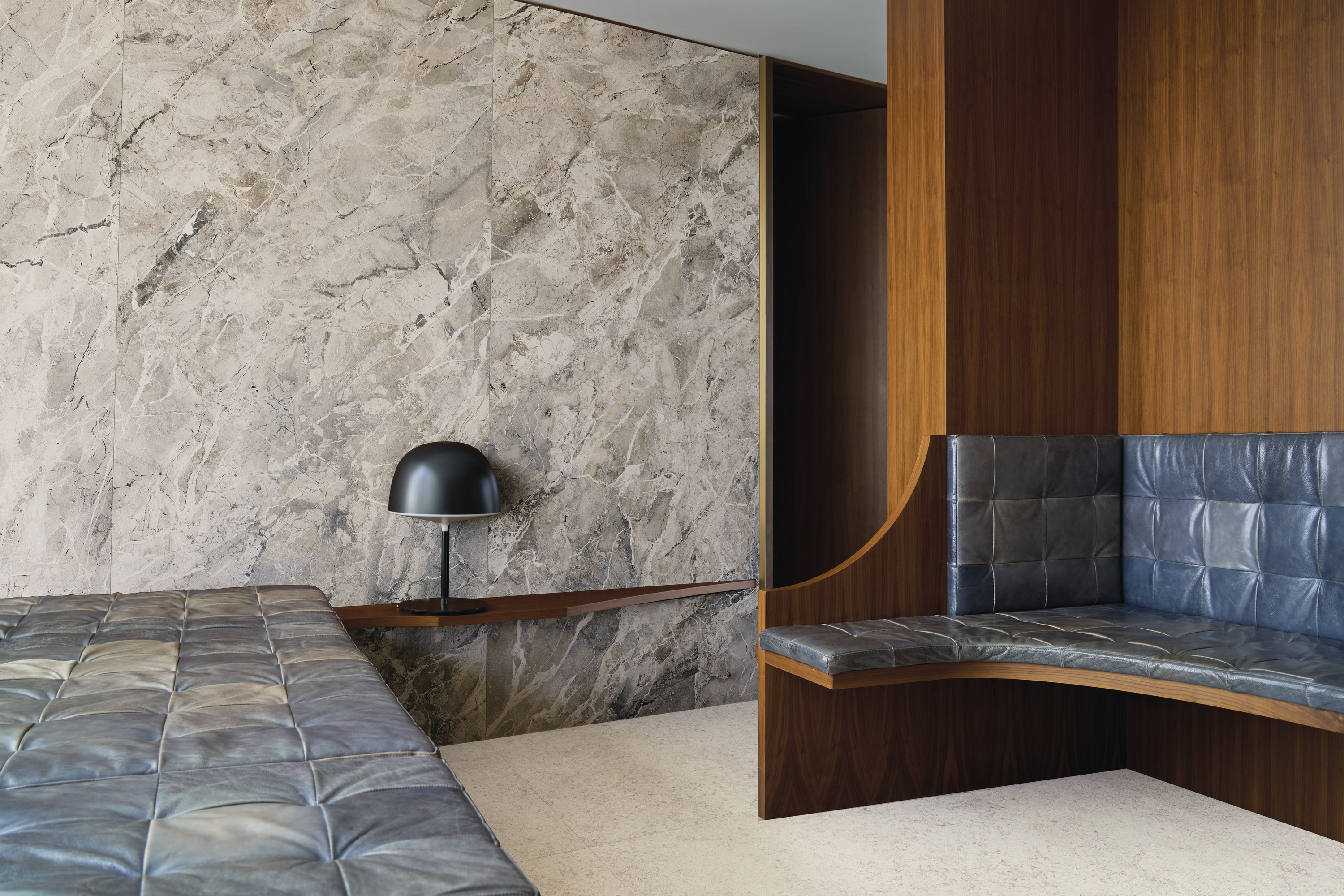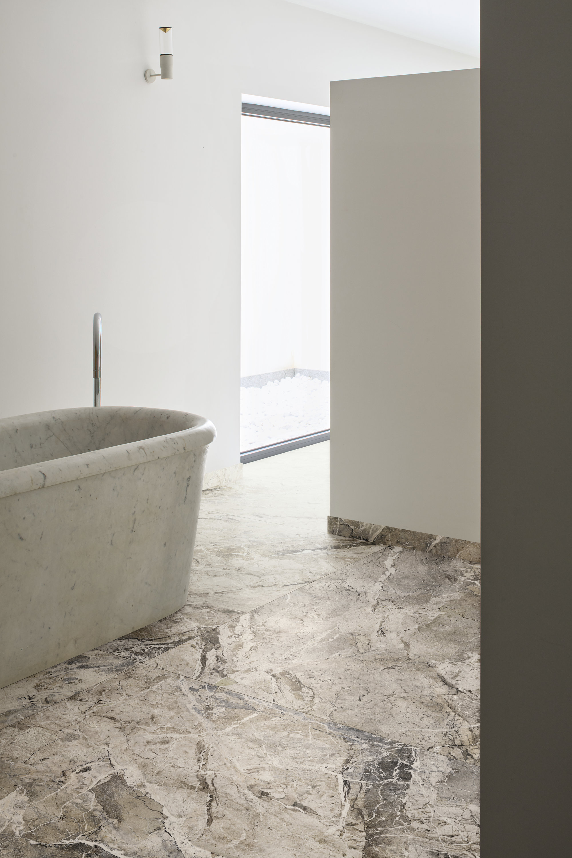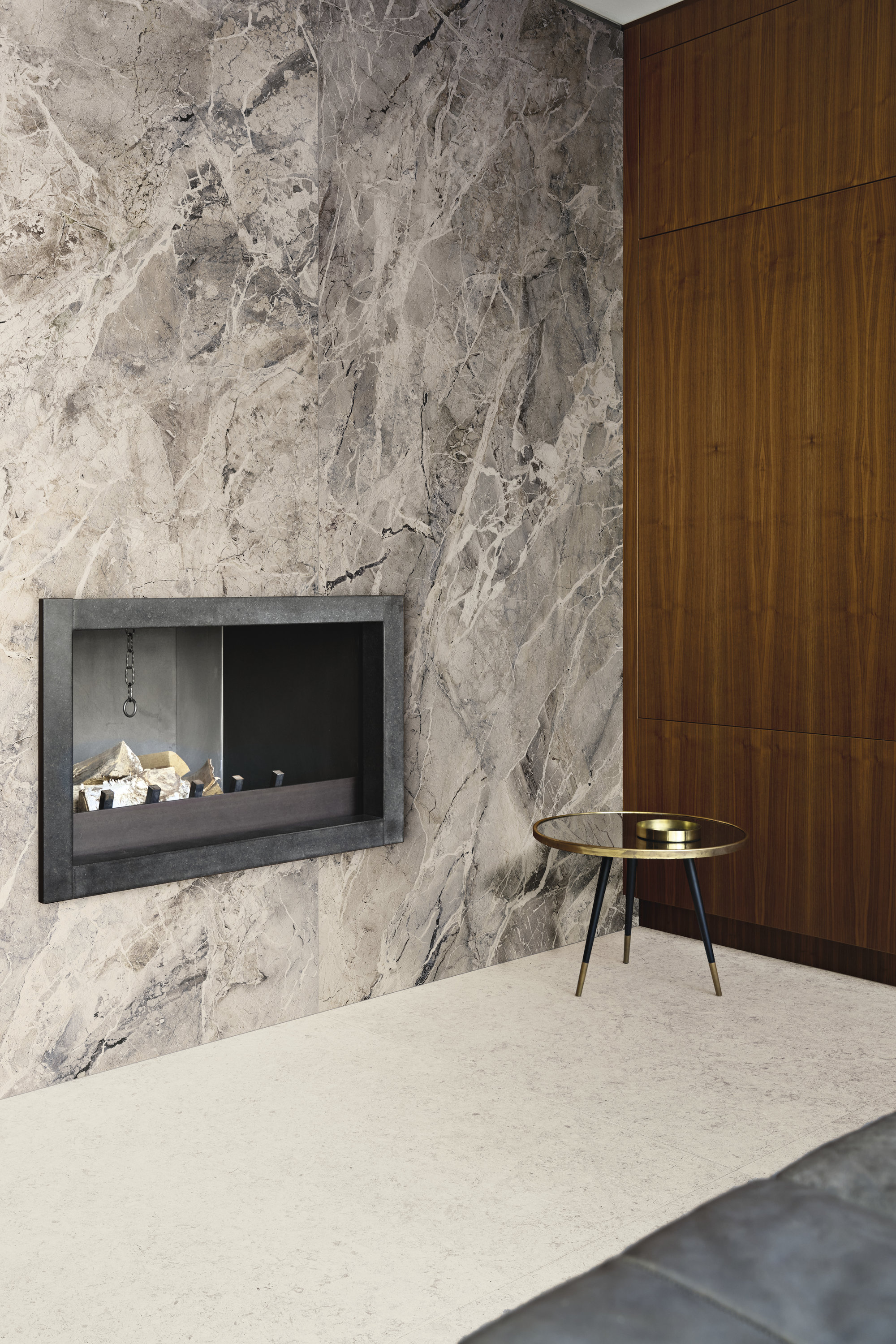 Matière scénographique qui met en valeur les suggestions des brèches naturelles, avec un fond aux tons bleus et gris traversé de fragments clairs et de variations irrégulières. C’est une surface qui ne passe pas inaperçue, parfaite pour créer des points focaux ou des atmosphères sophistiquées. Les finitions Natural et Natural Plus soulignent la richesse du dessin, tandis que les grands formats jusqu’à 270×120 cm amplifient la continuité visuelle, transformant Breccia Blu en un matériau qui décore avec la force expressive de la pierre la plus précieuse. La grande dalle Breccia Blu est réalisée avec une technologie révolutionnaire à base d’eau. Une véritable nouveauté pour le secteur, qui allie durabilité environnementale et rendu esthétique de très haut niveau.