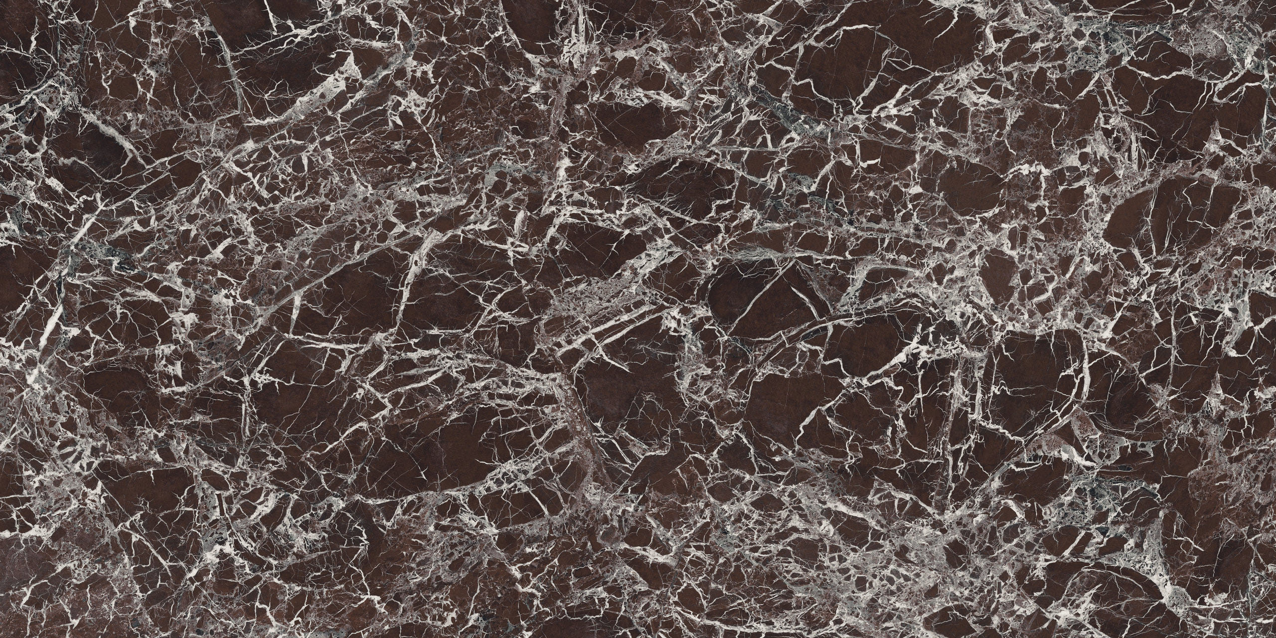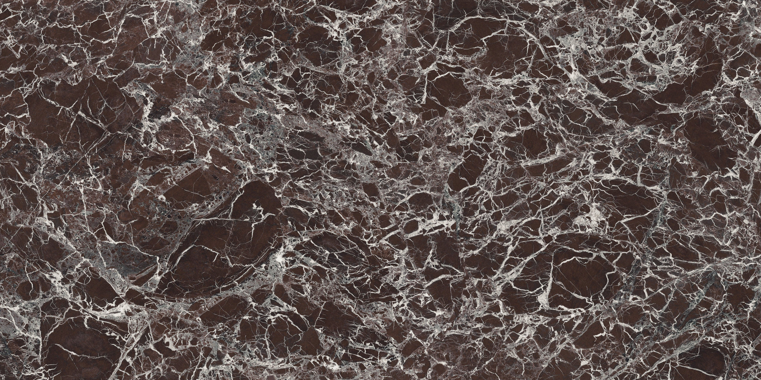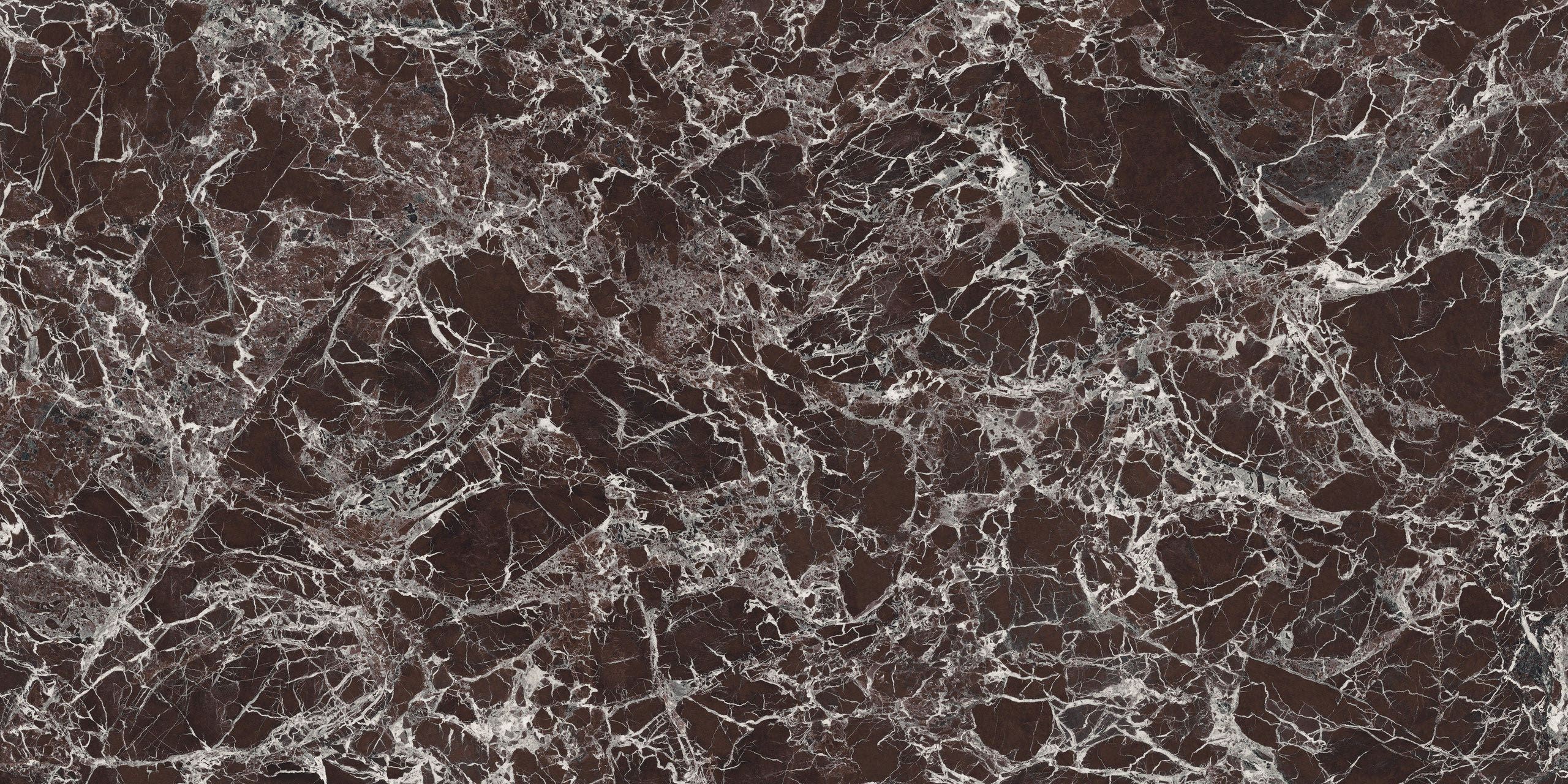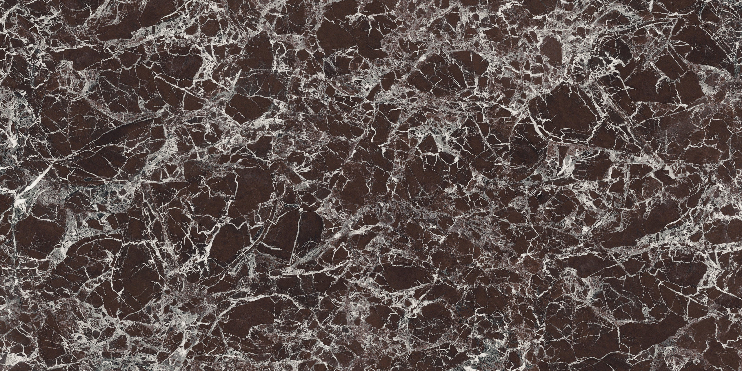Le motif effet brèche se fait majestueux et impérial : un réseau très fin de veines lactées se déploie sur la surface pourpre et bordeaux, parfois interrompue par des intrusions foncées ou plus froides. L’œuvre minérale, dans sa rigueur et son imprévisibilité, arbore une identité esthétique à la fois uniforme et infiniment variable.