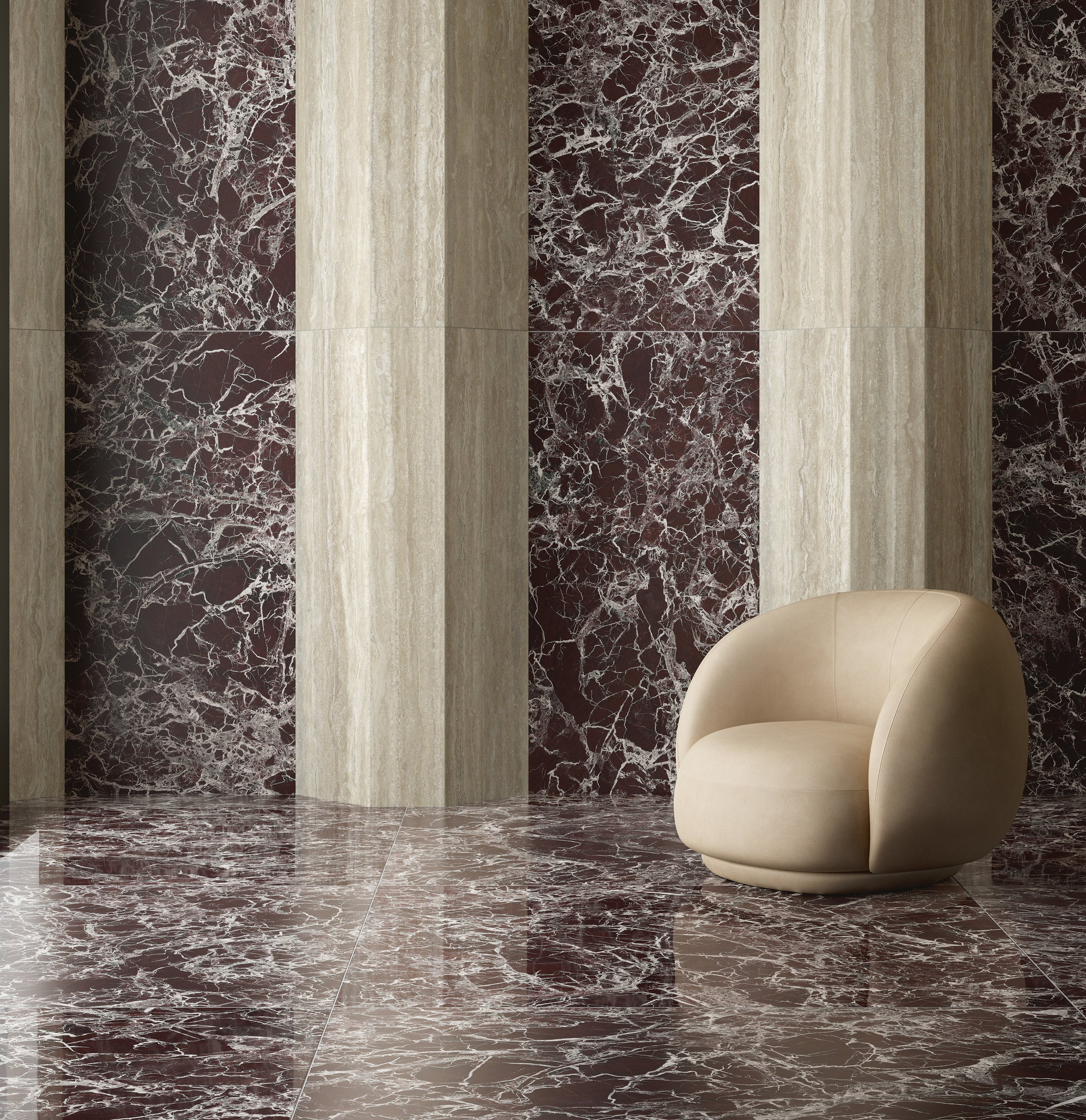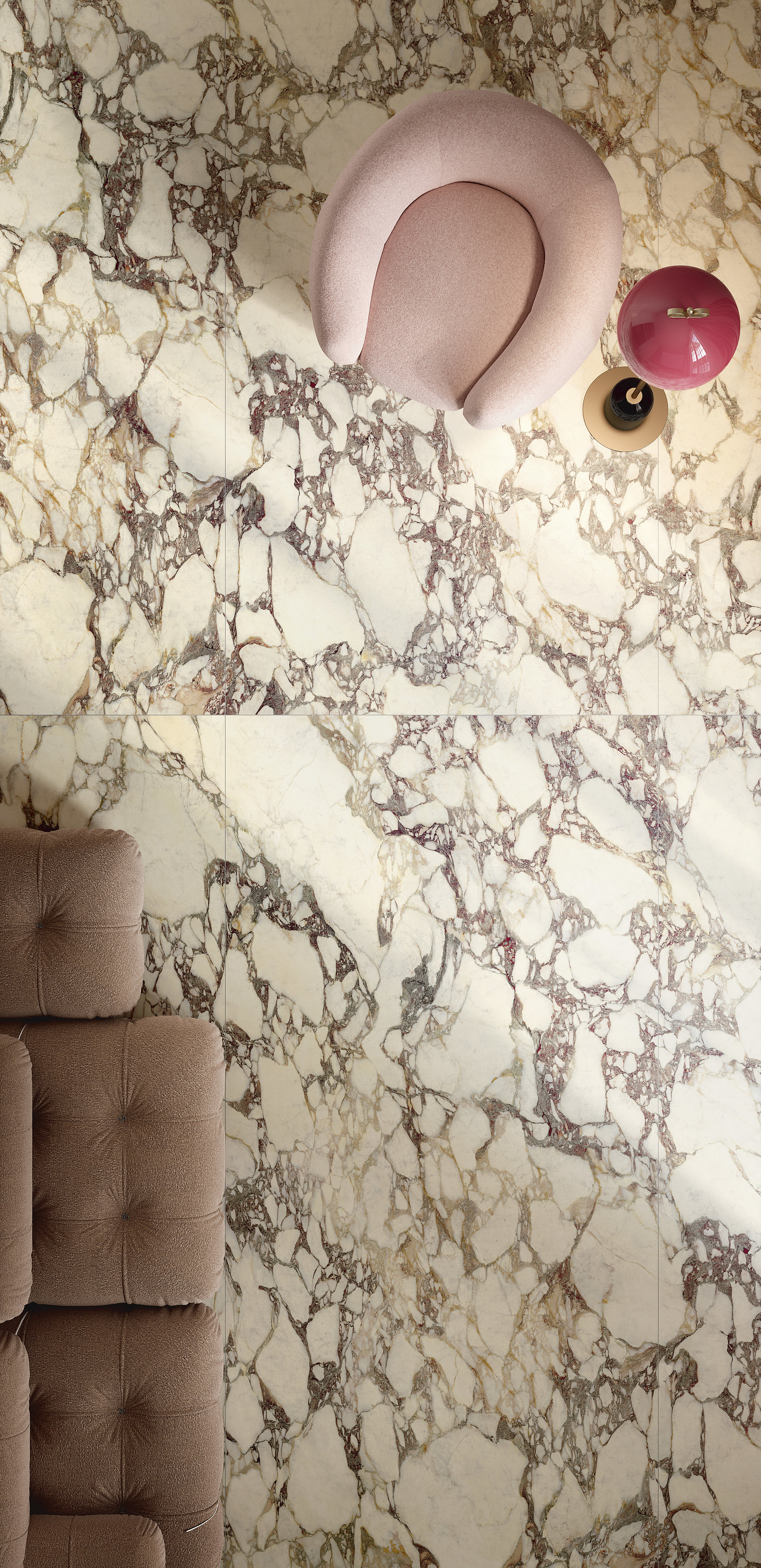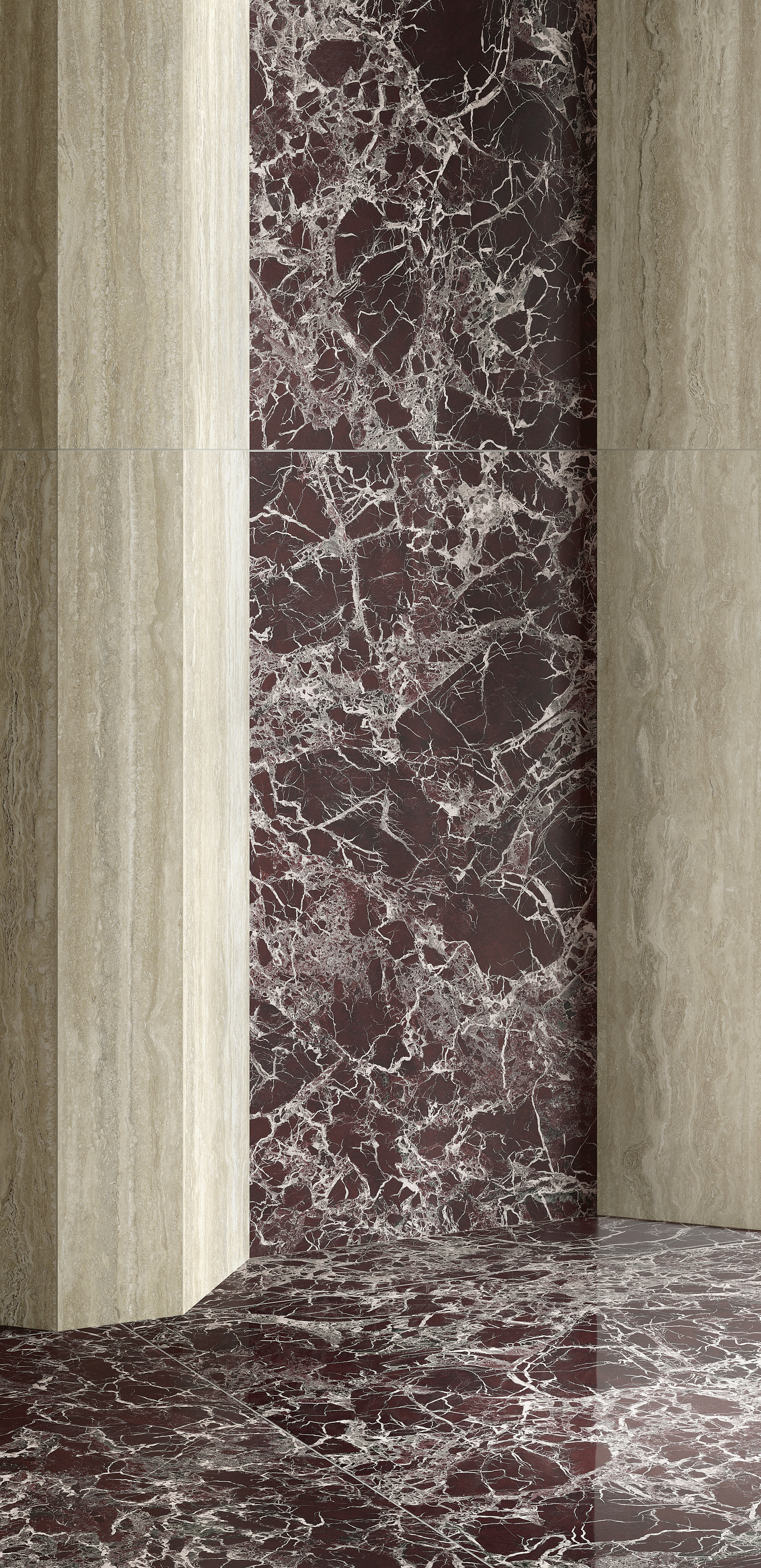 Le motif effet brèche se fait majestueux et impérial : un réseau très fin de veines lactées se déploie sur la surface pourpre et bordeaux, parfois interrompue par des intrusions foncées ou plus froides. L’œuvre minérale, dans sa rigueur et son imprévisibilité, arbore une identité esthétique à la fois uniforme et infiniment variable.