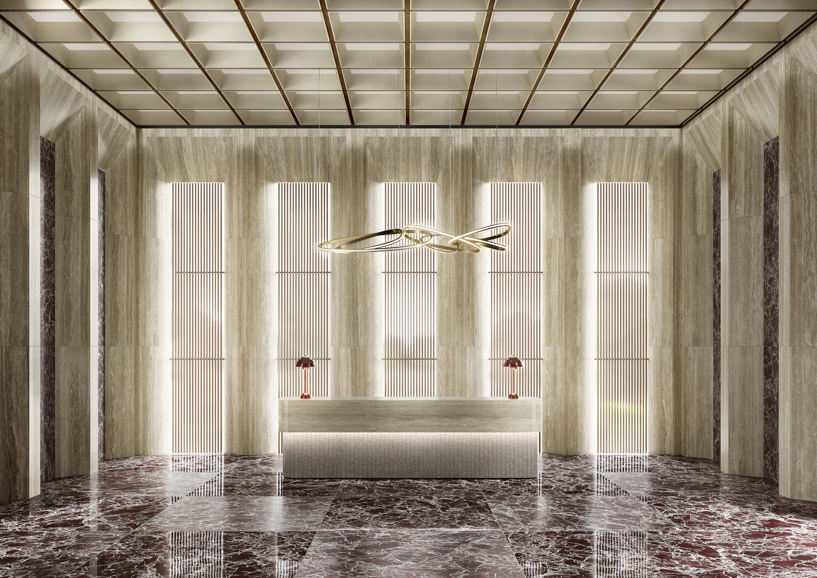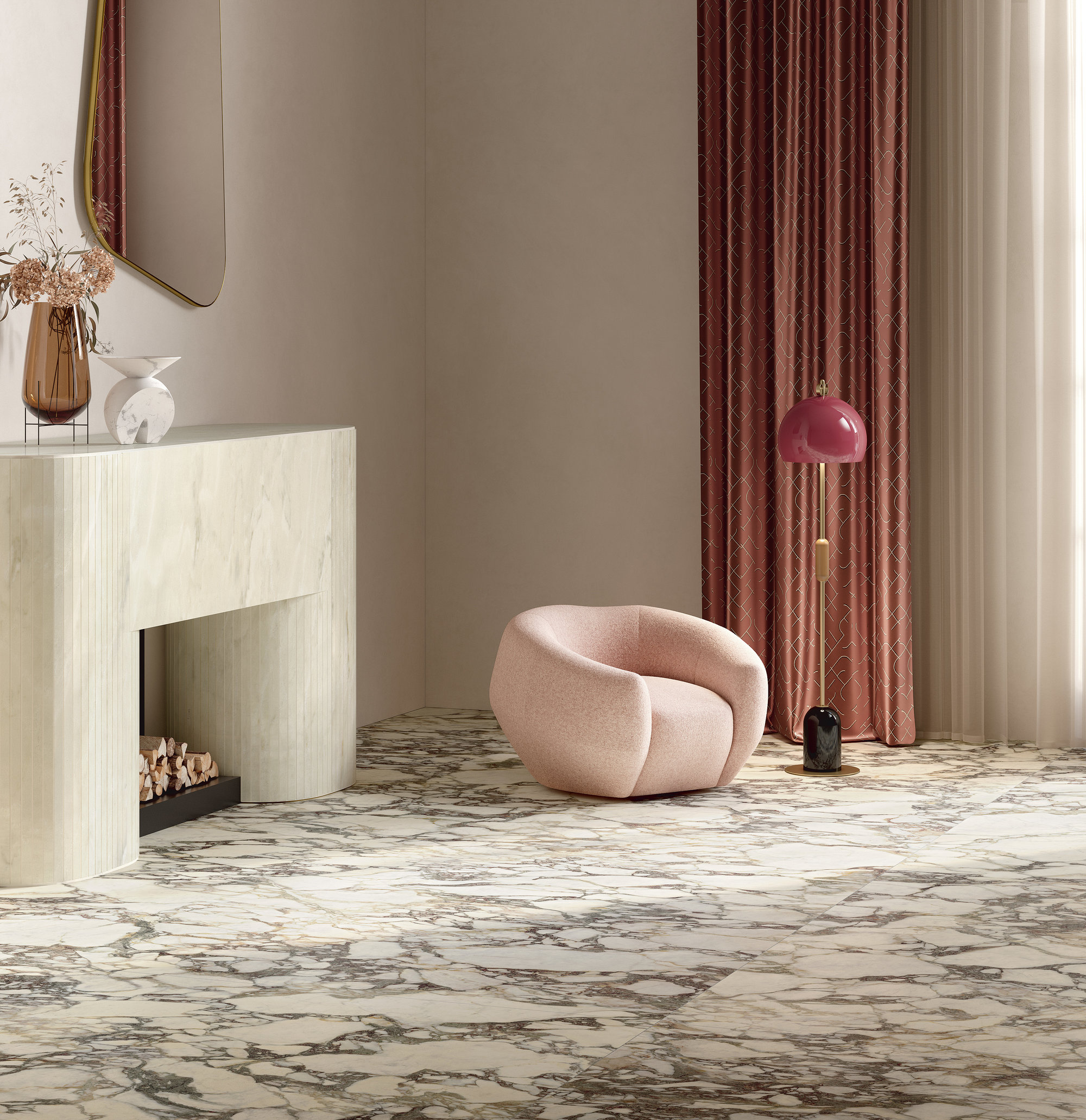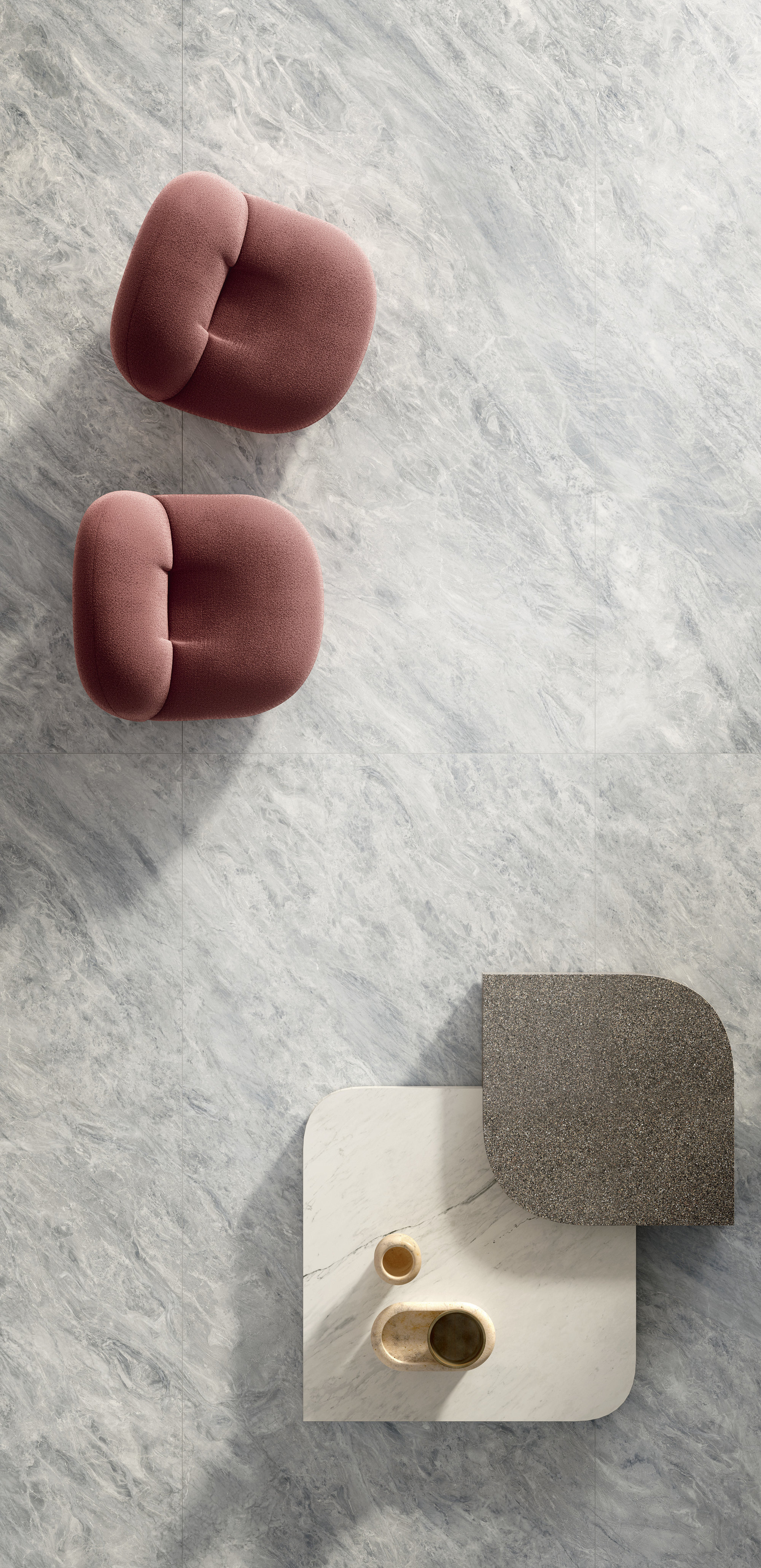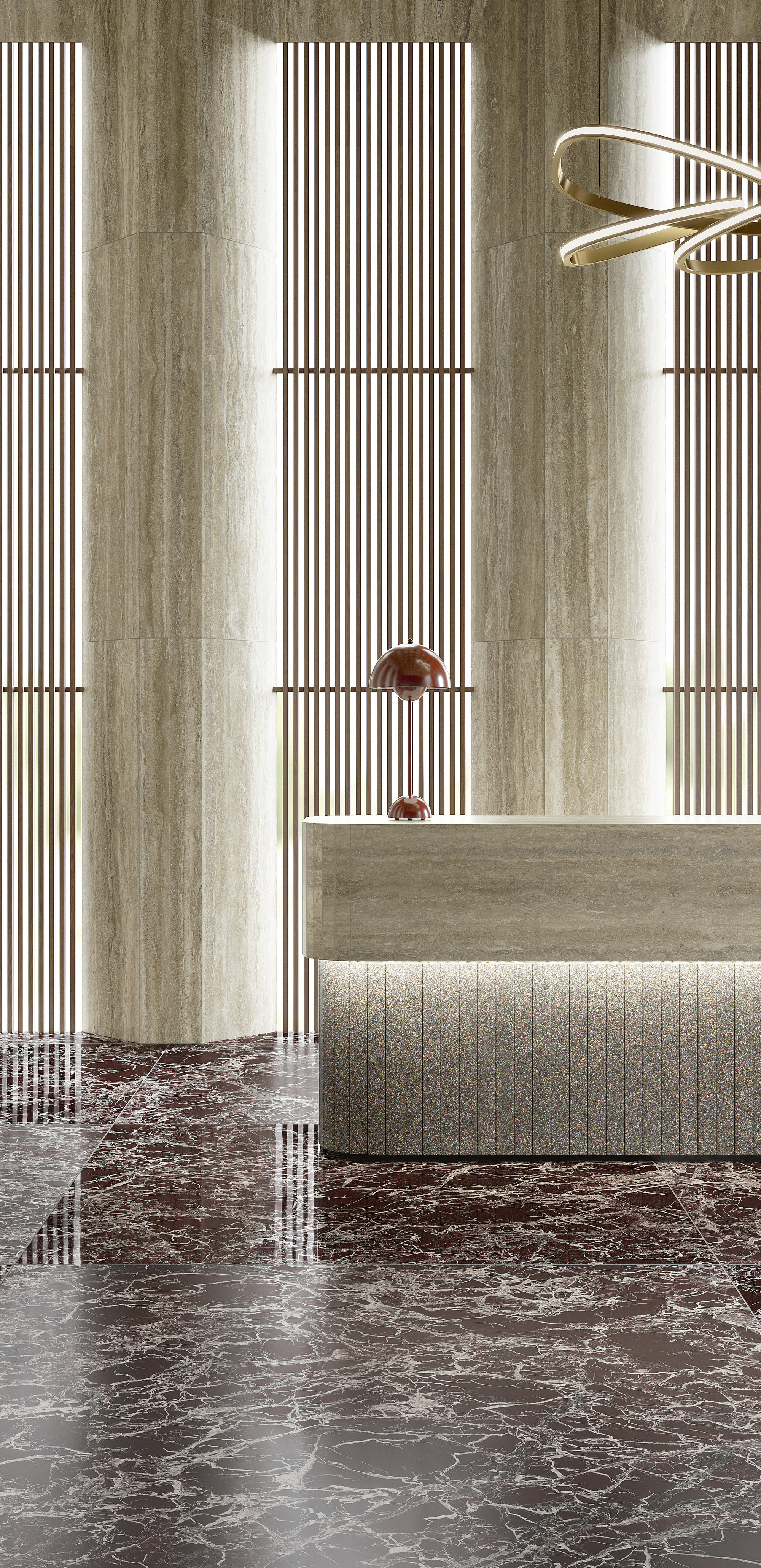 Le motif effet brèche se fait majestueux et impérial : un réseau très fin de veines lactées se déploie sur la surface pourpre et bordeaux, parfois interrompue par des intrusions foncées ou plus froides. L’œuvre minérale, dans sa rigueur et son imprévisibilité, arbore une identité esthétique à la fois uniforme et infiniment variable.