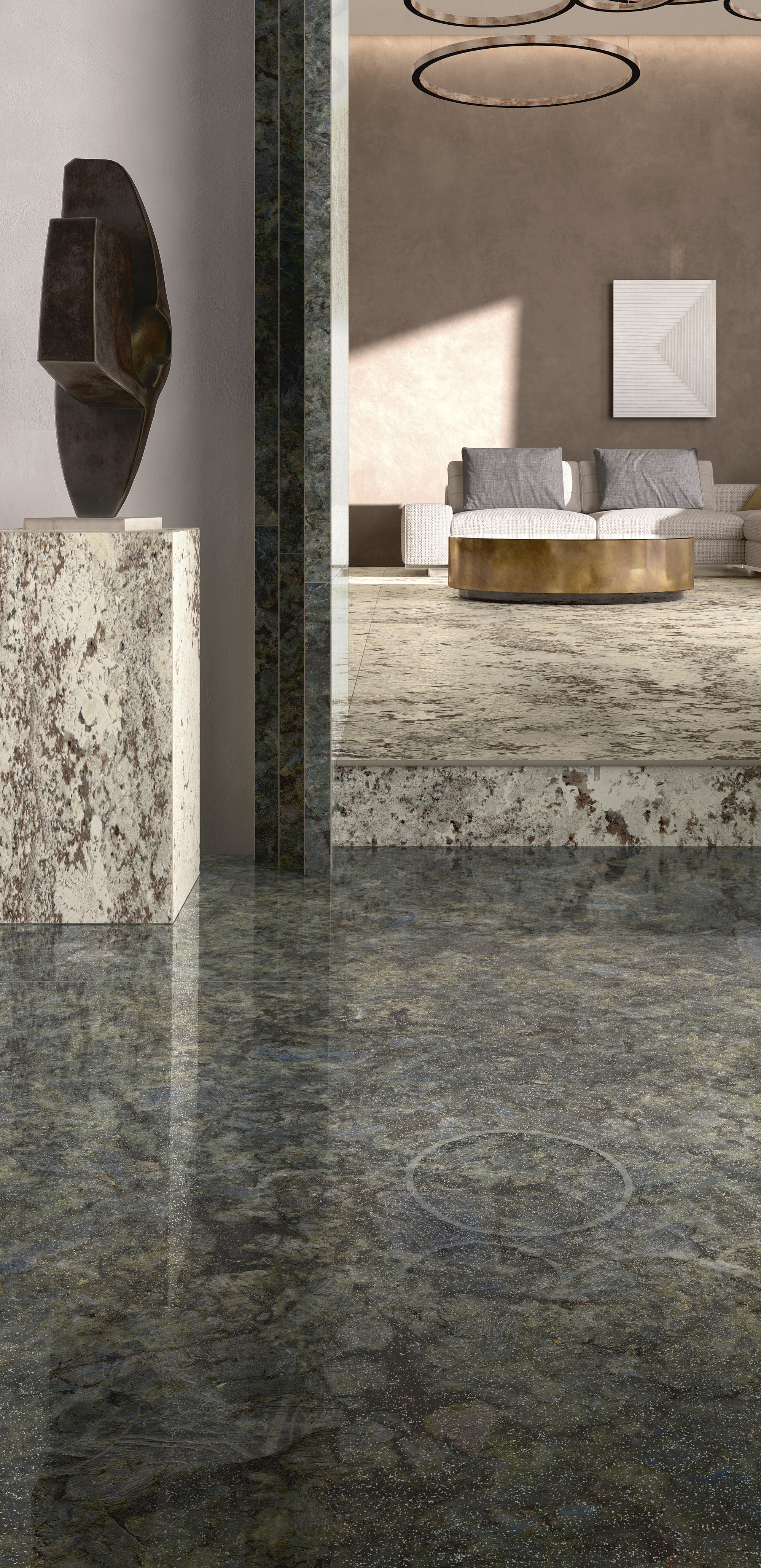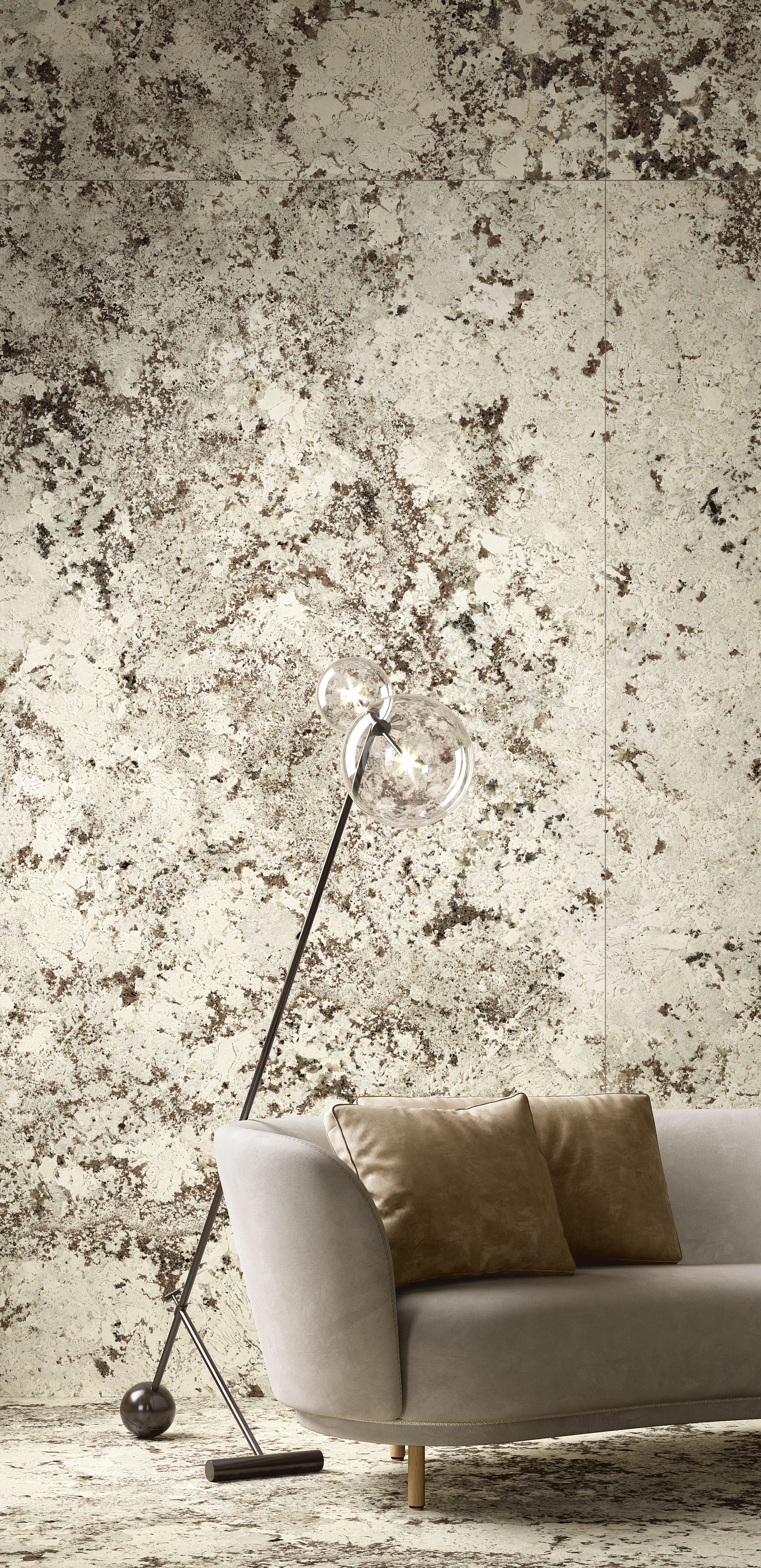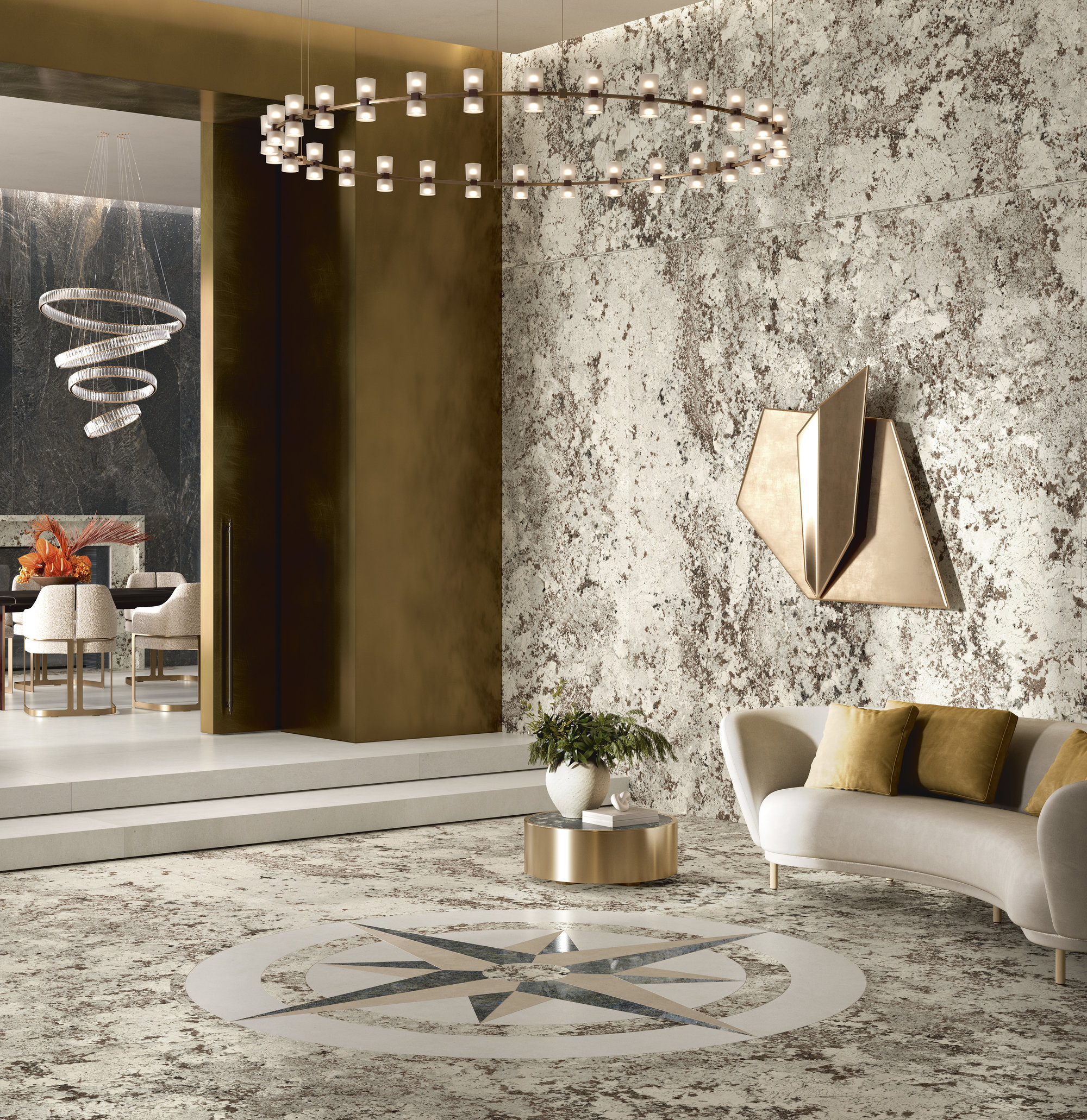 Telle une œuvre de Jackson Pollock, un vrai dripping de couleur blanche, marron, rouge et grise sur une « toile céramique » immaculée. La singularité se trouve dans l’explosion de couleur ravivée par deux finitions inédites, Lappato* et semi-lustrée, qui donnent envie de caresser la surface.