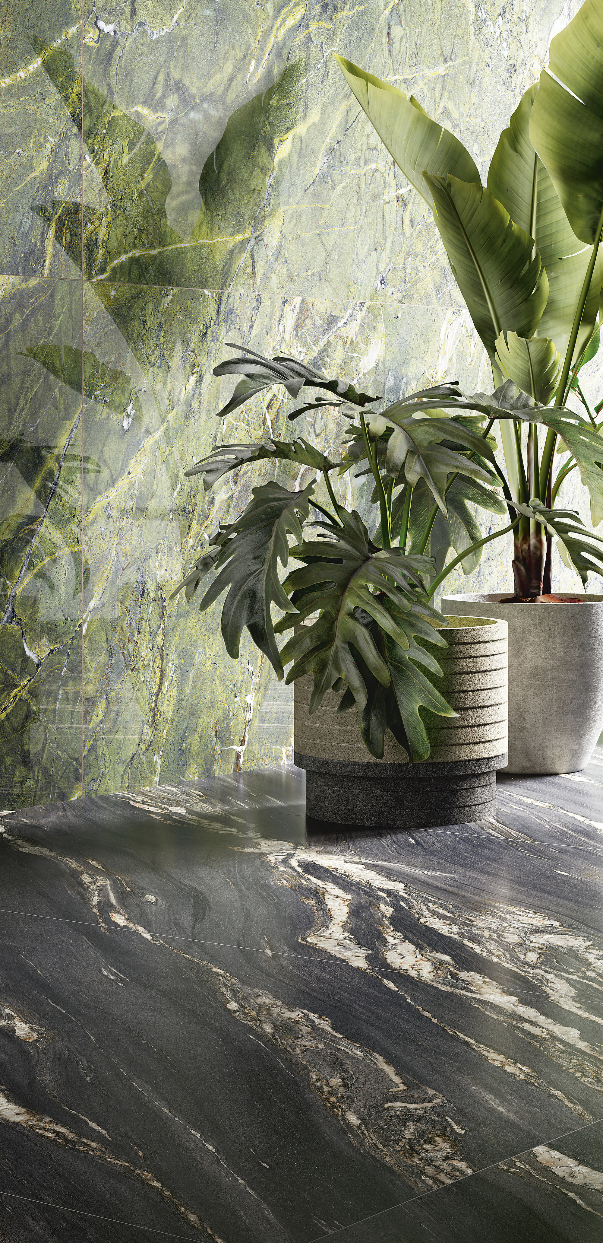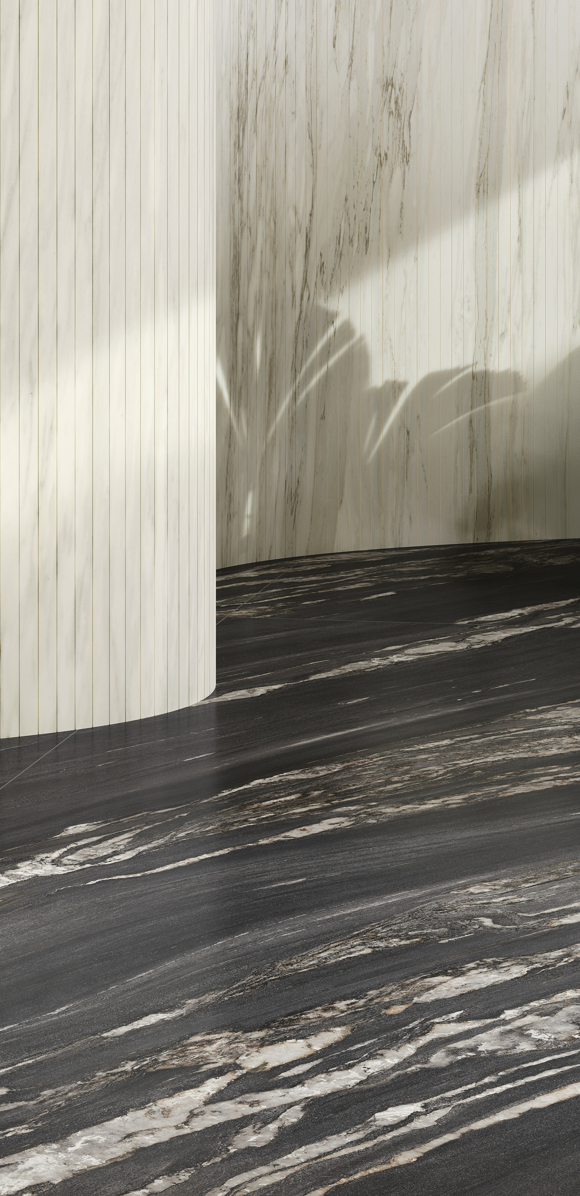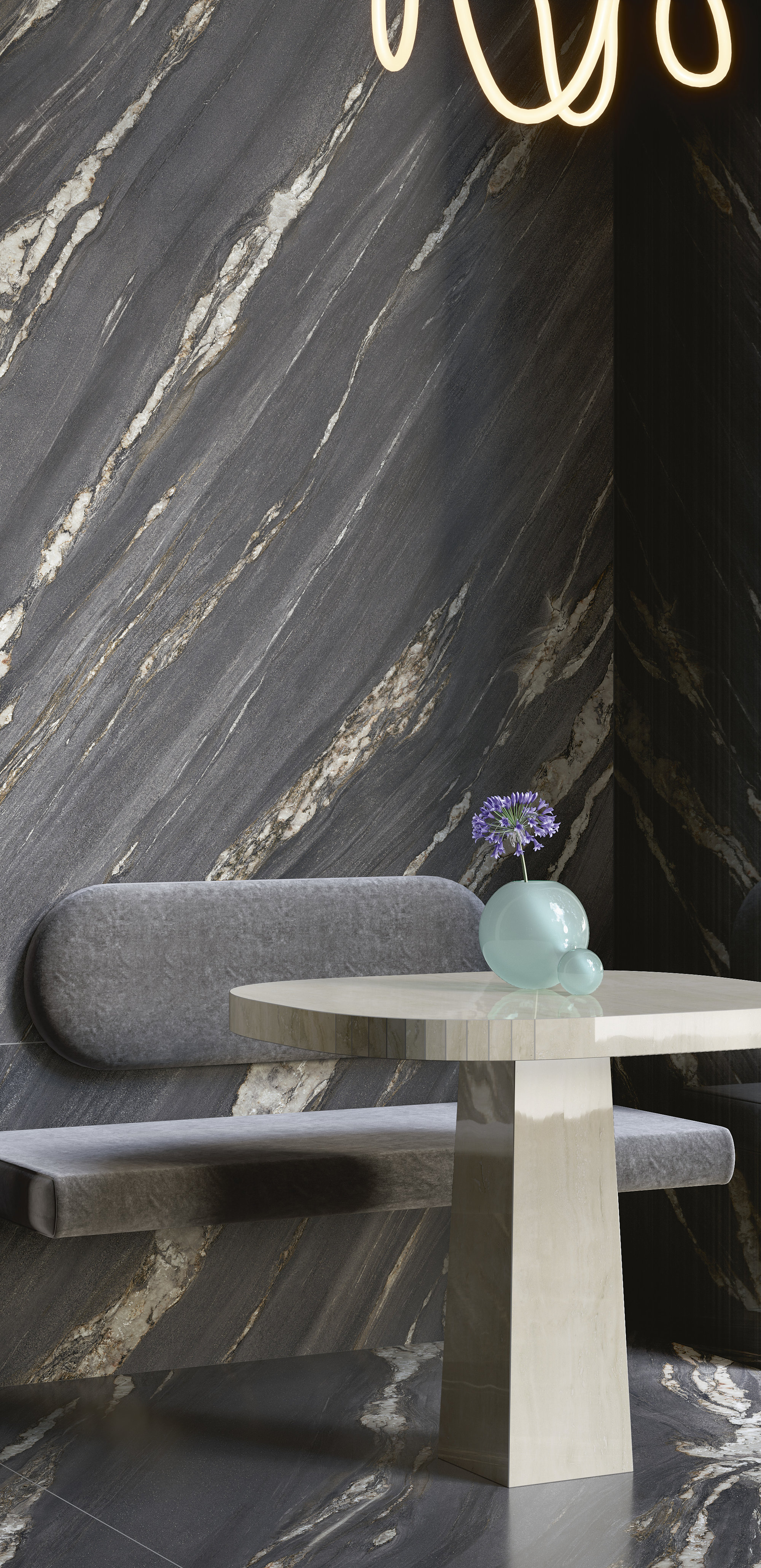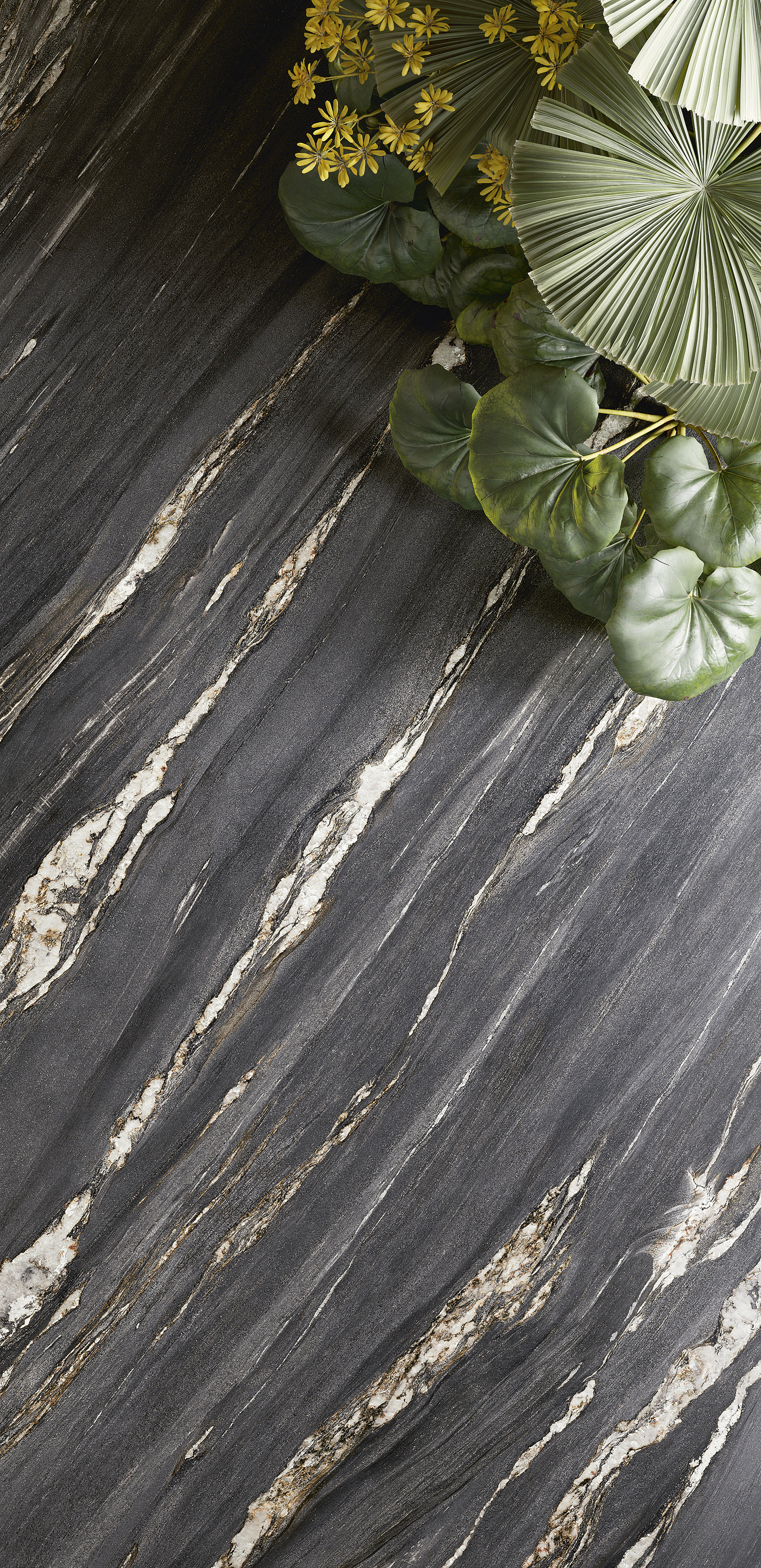 Comme un décor de théâtre, le marbre met en scène des œuvres illuminées par une forte ardeur décorative. Des arabesques minérales, semblables à des flammes or brunâtre, s’ouvrent et se suivent sur la surface. D’un mouvement ondulé, elles réchauffent et exaltent une surface minérale au charme dramatique et mystérieux.