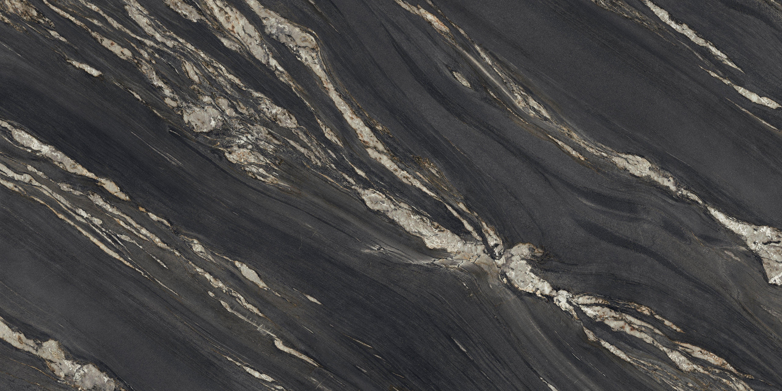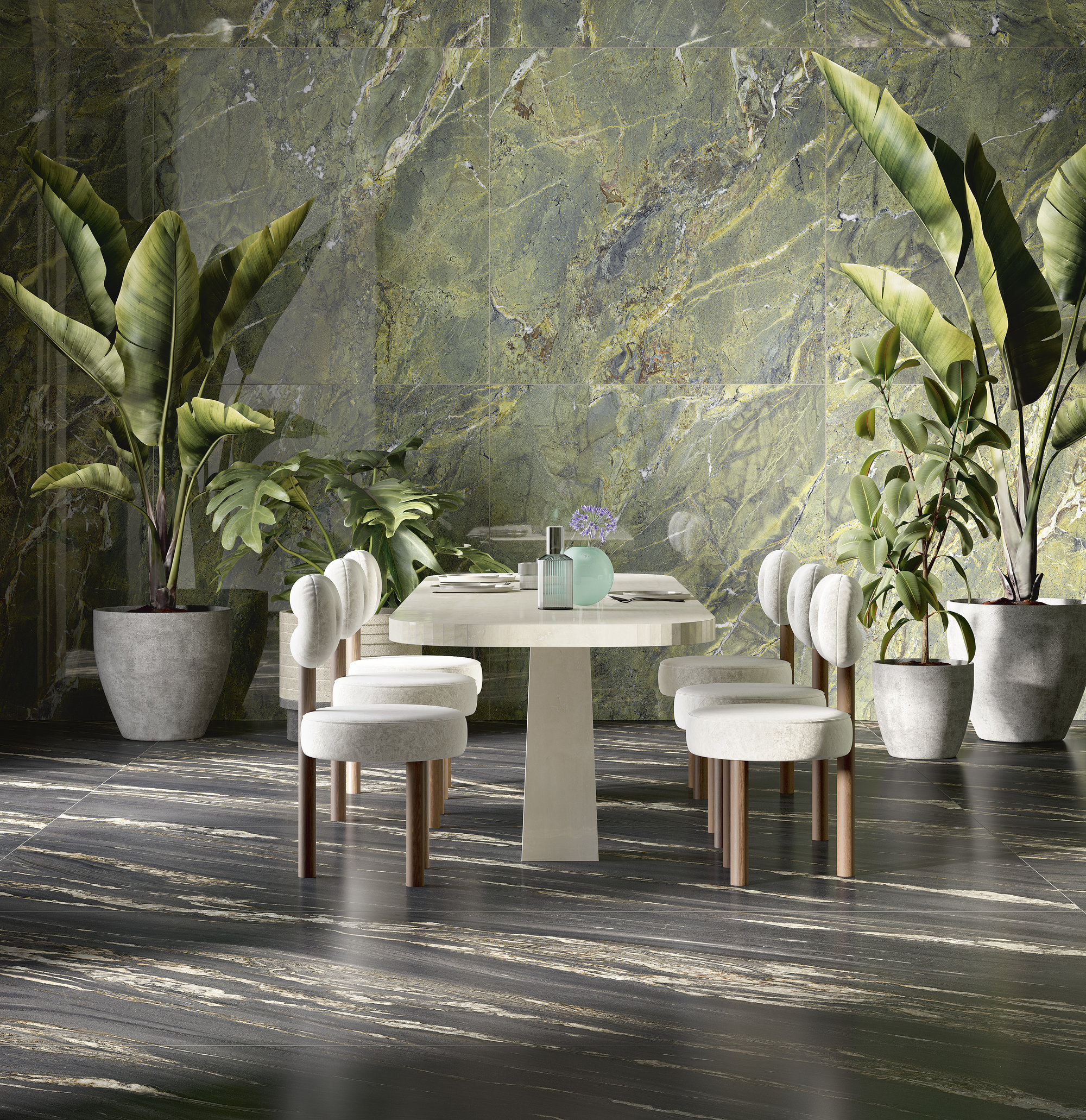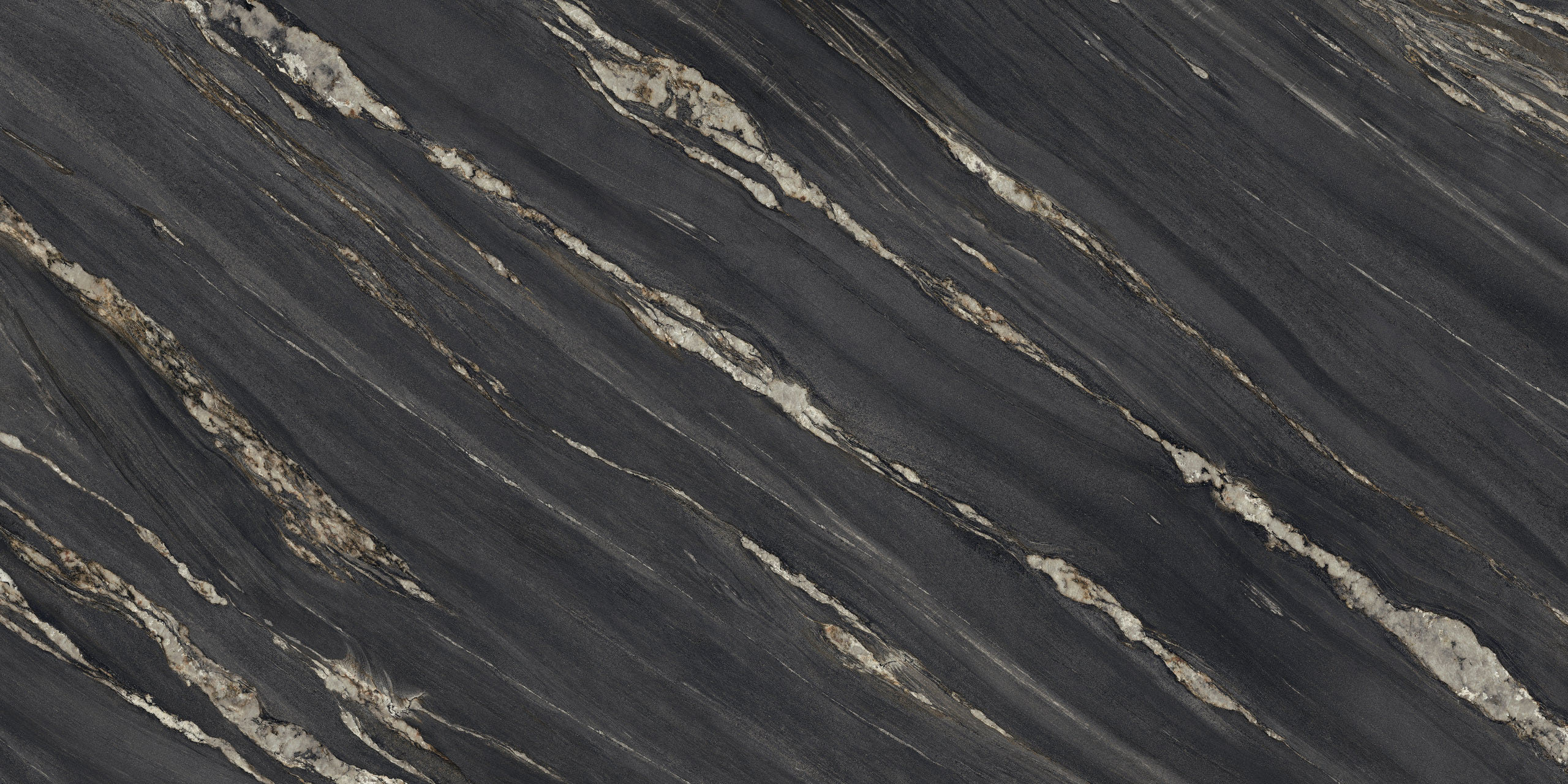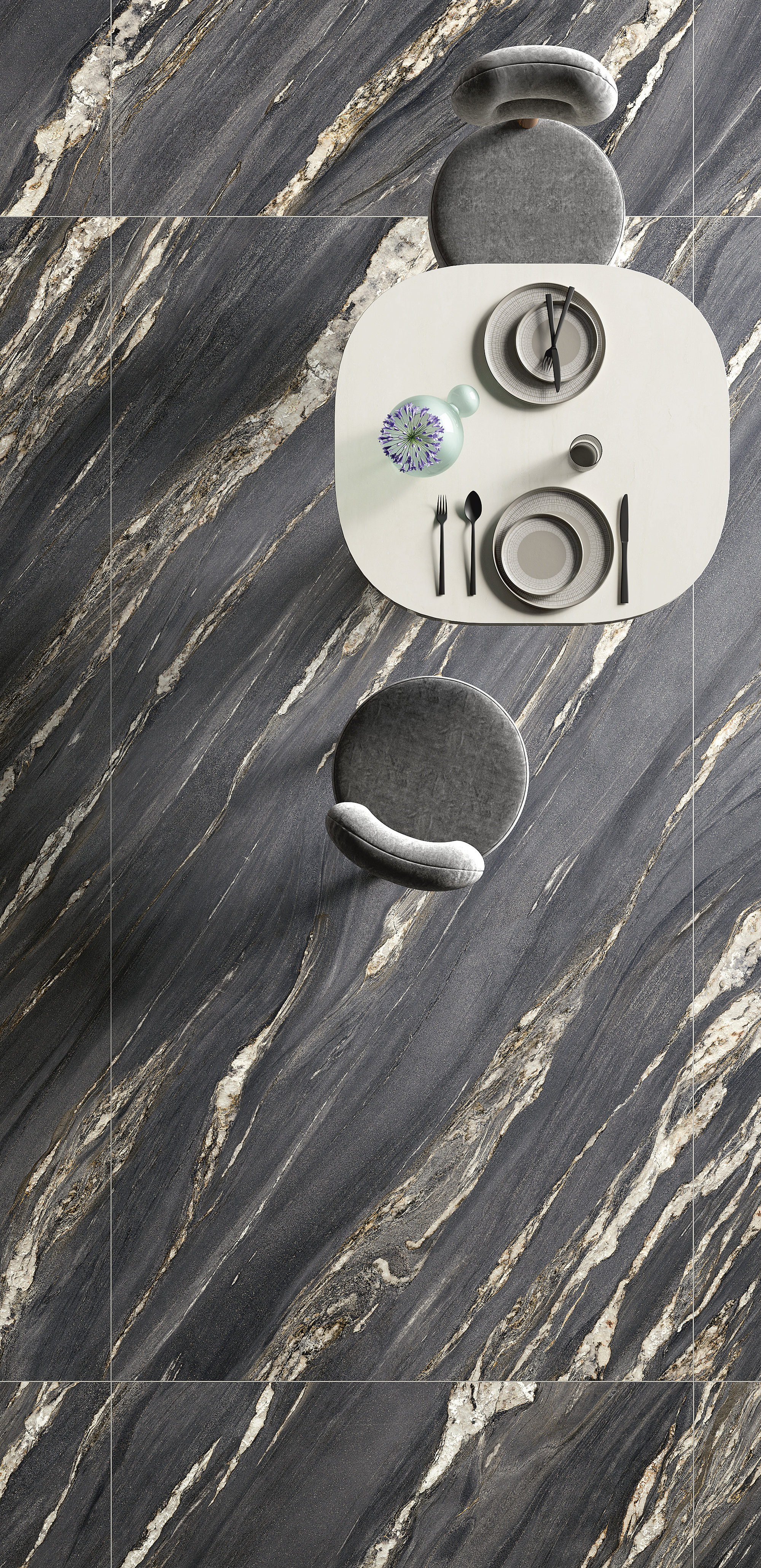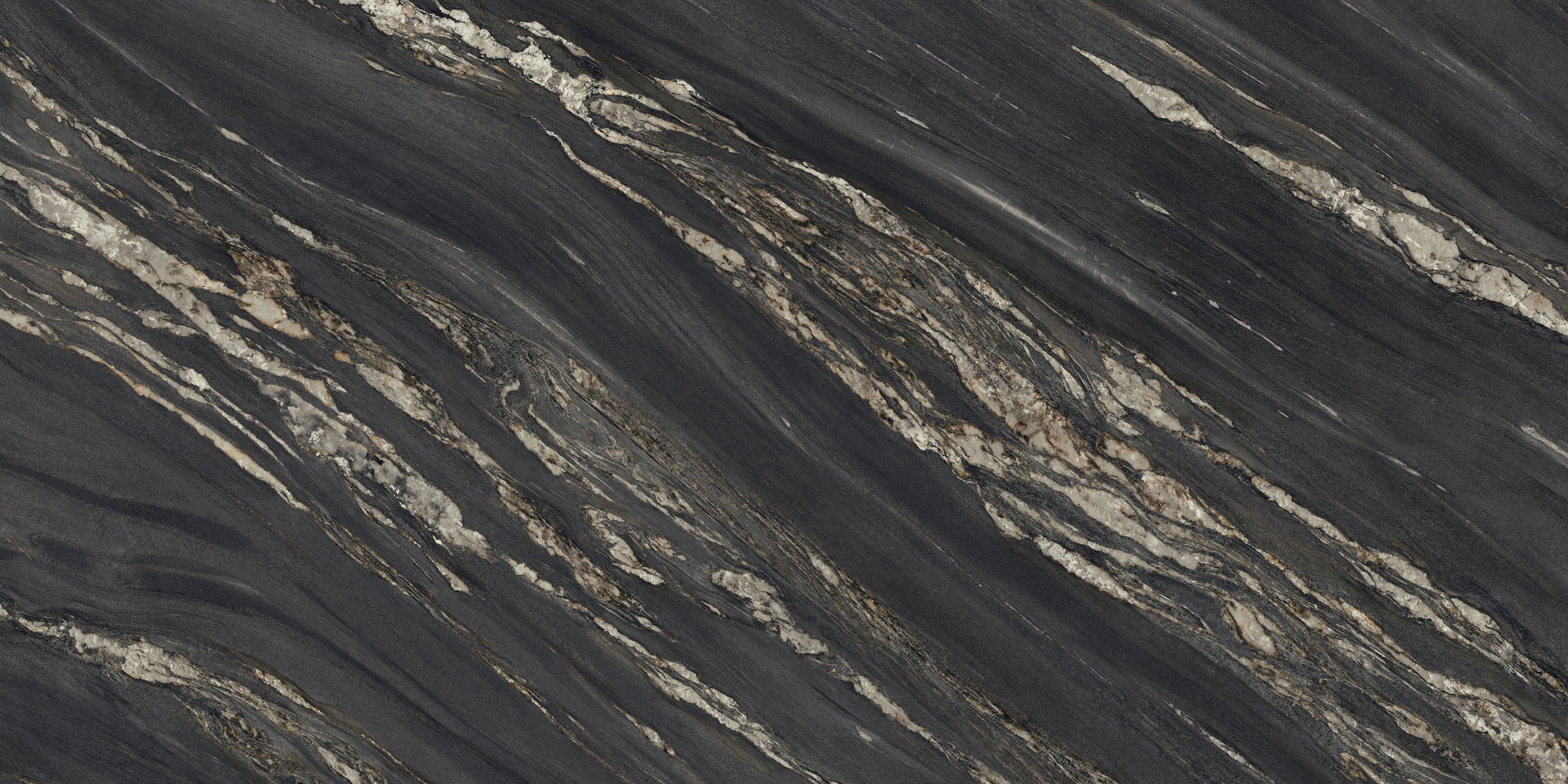 Comme un décor de théâtre, le marbre met en scène des œuvres illuminées par une forte ardeur décorative. Des arabesques minérales, semblables à des flammes or brunâtre, s’ouvrent et se suivent sur la surface. D’un mouvement ondulé, elles réchauffent et exaltent une surface minérale au charme dramatique et mystérieux.