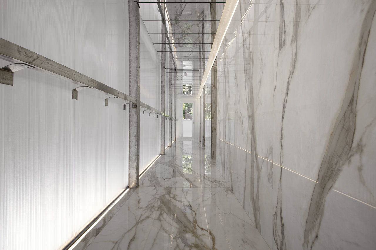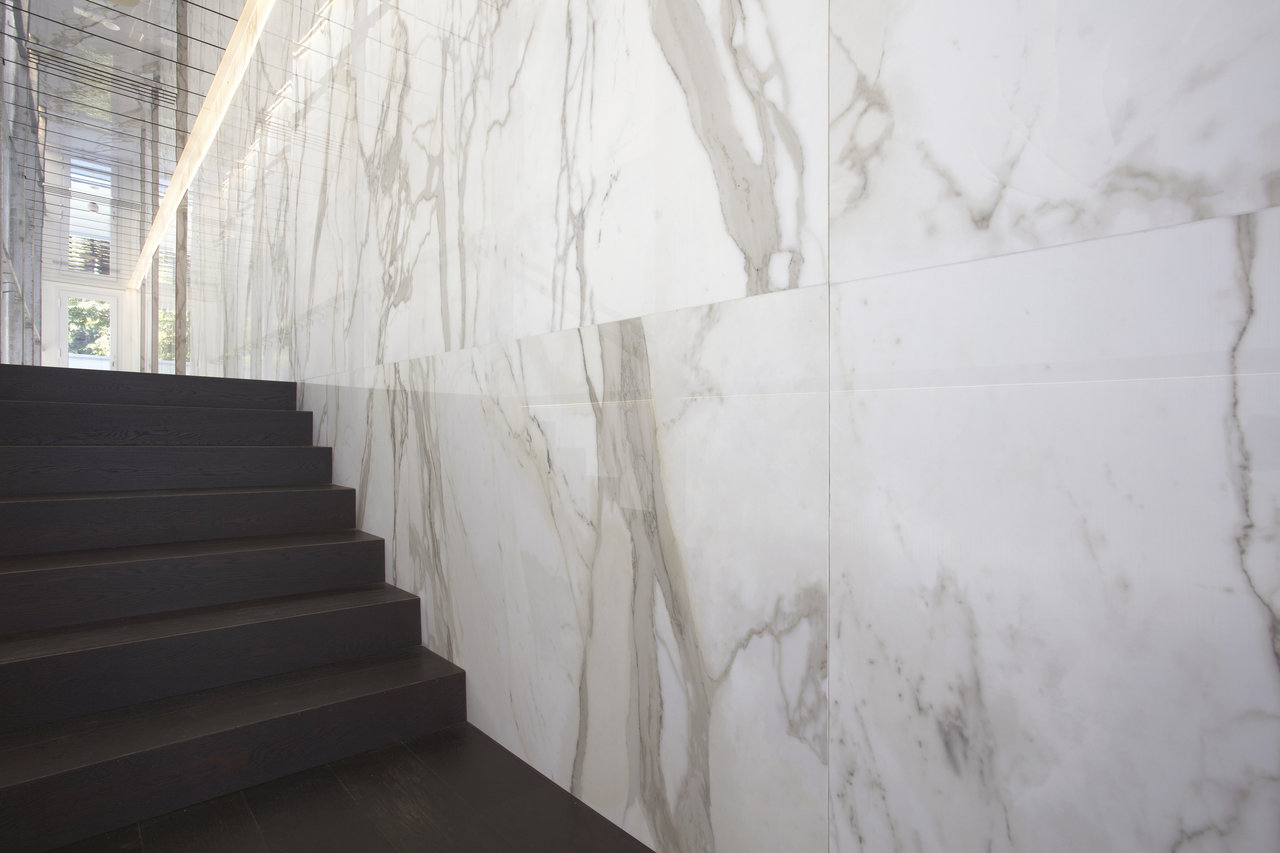 Pour le revêtement du sol, on a choisi les surfaces Quiet Rock de la collection Quietstones Maximum avec des dalles de 150×150 cm et Calacatta Elite de la collection Marmi Maximum dans des grandes dalles de 300×150 cm avec une finition brillante.