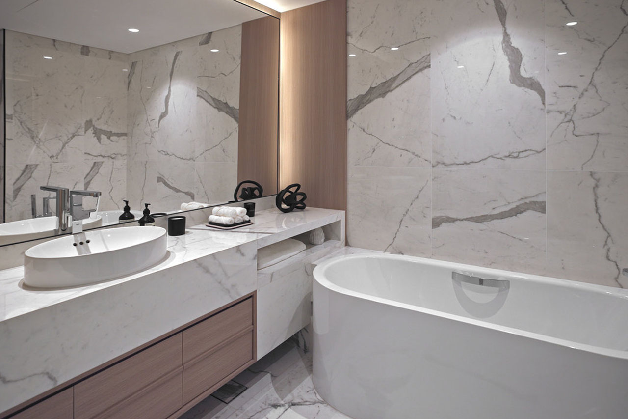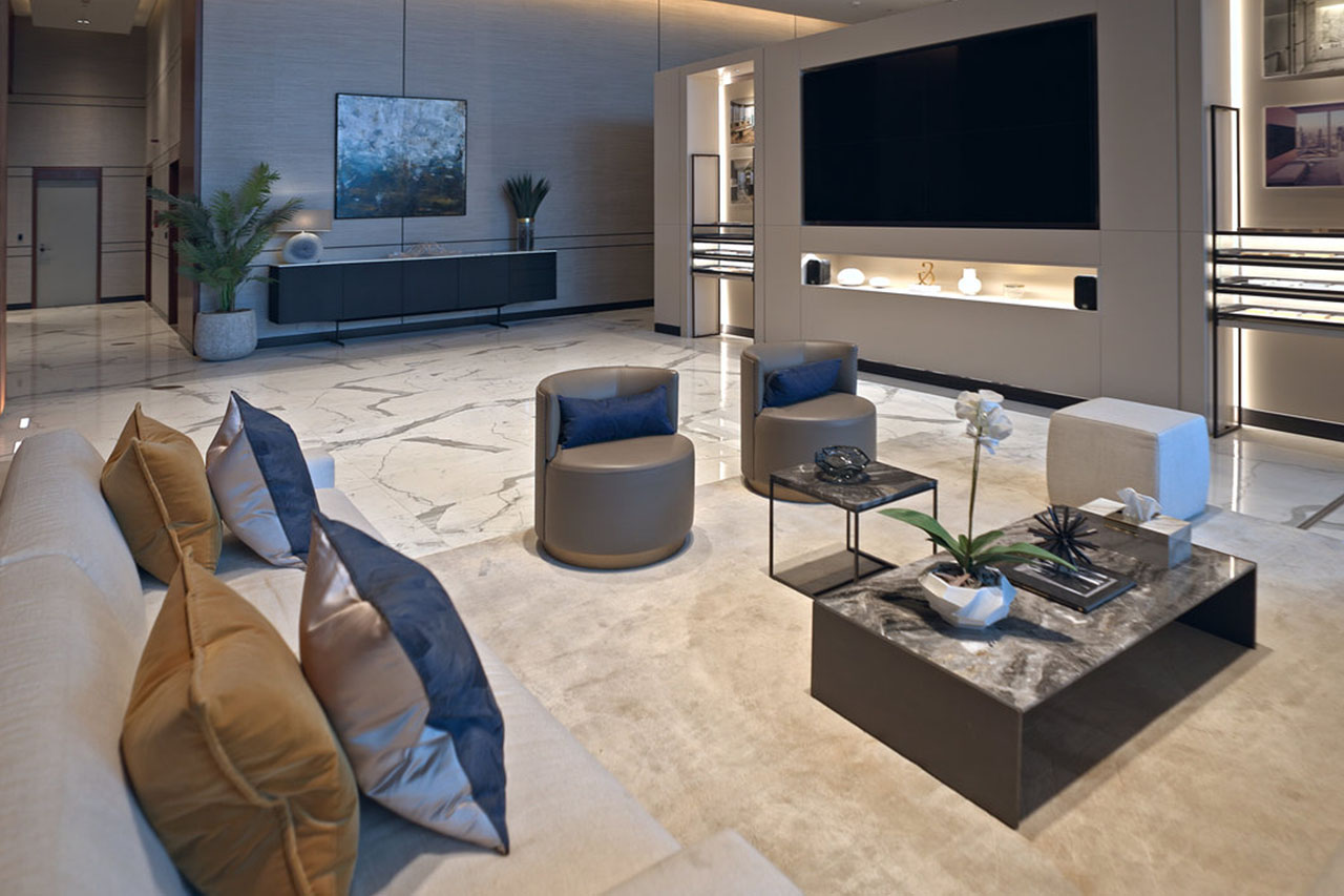 Fiandre Architectural Surfaces, en collaboration avec son partenaire distributeur Arteco Ceramics, a fourni des surfaces céramiques innovantes et sur mesure, notamment Calacatta Statuario et Travertino Maximum, utilisées dans les espaces communs, les appartements et les finitions décoratives. Ces solutions allient élégance, durabilité et réduction des déchets, contribuant à l’objectif de certification LEED Gold et à la vision des Émirats Arabes Unis vers la neutralité carbone d’ici 2050.