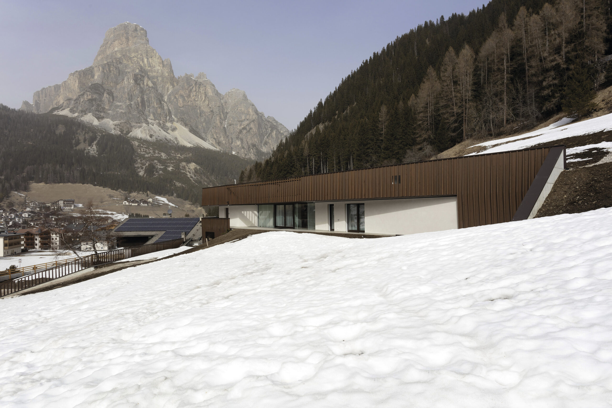 Implantée dans le paysage alpin de Corvara, au cœur de l’Alta Badia, cette résidence privée conçue par Birghit Kostner propose une interprétation contemporaine de l’habitat en dialogue équilibré avec son environnement montagnard. L’architecture s’insère avec discrétion dans la pente, en suivant la morphologie du terrain et en ouvrant des vues maîtrisées sur les Dolomites.