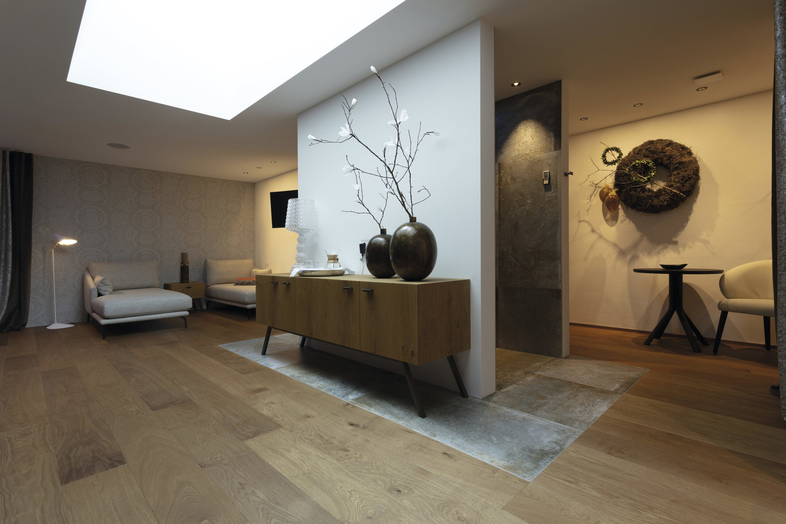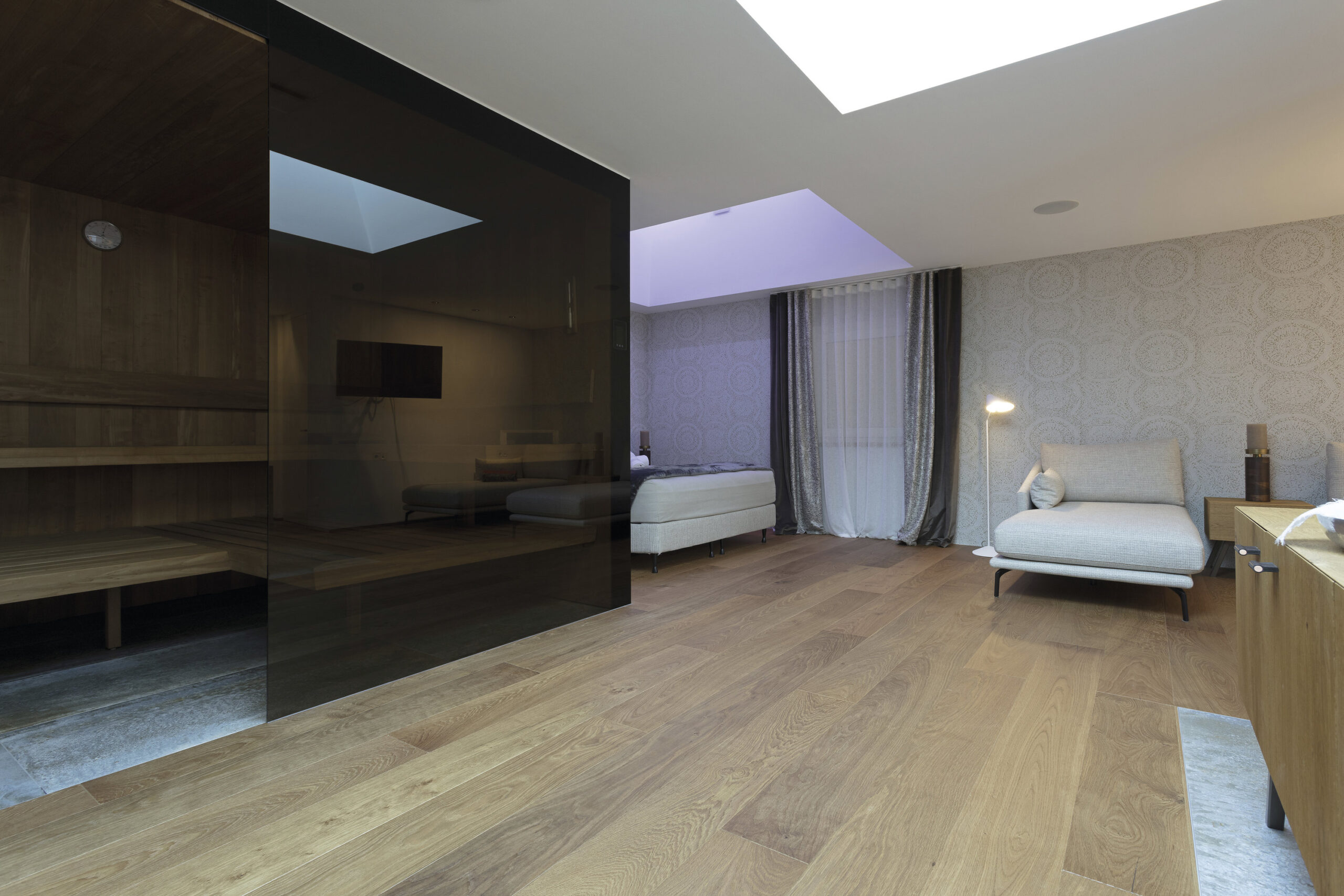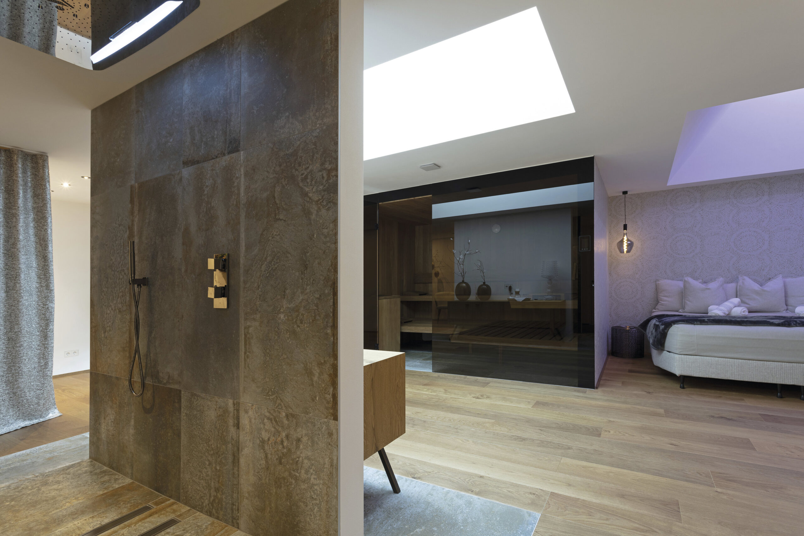 Les espaces intérieurs se développent comme un continuum fluide, marqué par une organisation claire et par un usage attentif de la lumière naturelle, introduite par de grandes baies et des lanterneaux zénithaux. Le bois domine les ambiances, apportant chaleur et continuité, tandis que la pierre et les finitions neutres renforcent le lien avec l’environnement alpin. Les espaces bien-être et les salles de bains adoptent une atmosphère plus intime et sensorielle, dédiée à la détente.