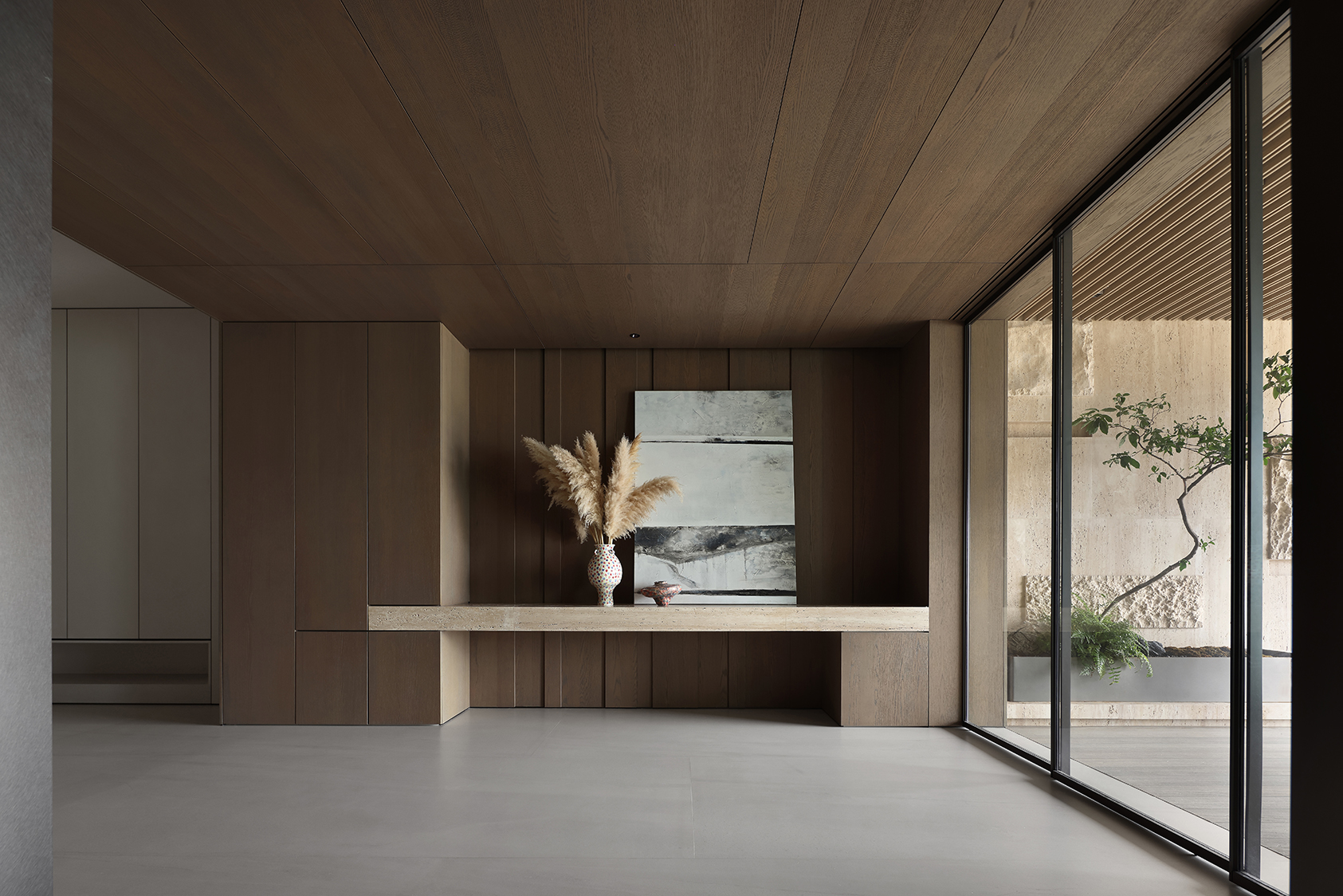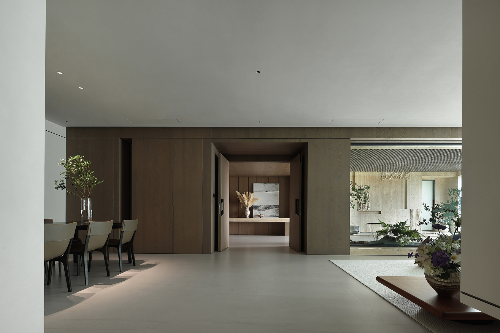 Dans les espaces principaux de la résidence, le contraste entre le sol aux tonalités neutres et leséléments en bois foncé crée un équilibre visuel qui confère aux espaces un caractère élégant et accueillant. Les grandes surfaces vitrées instaurent un dialogue constant entre intérieur et extérieur.