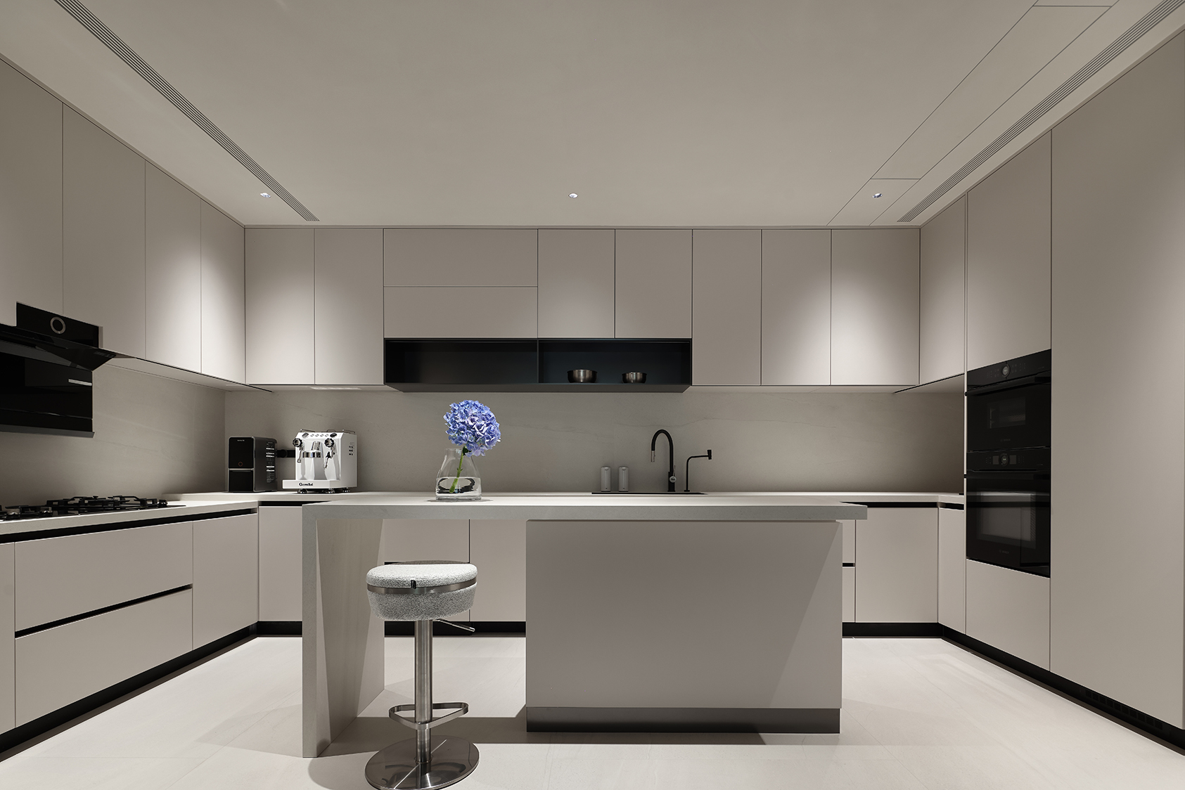 Dans la cuisine, le matériau revêt le plan de travail, les meubles hauts et la crédence, garantissantune continuité esthétique maximale en dialogue avec l’architecture de l’espace. Ce choix de conception renforce la perception d’uniformité et de pureté formelle, tout en valorisant l’hygiène et la praticité d’utilisation.