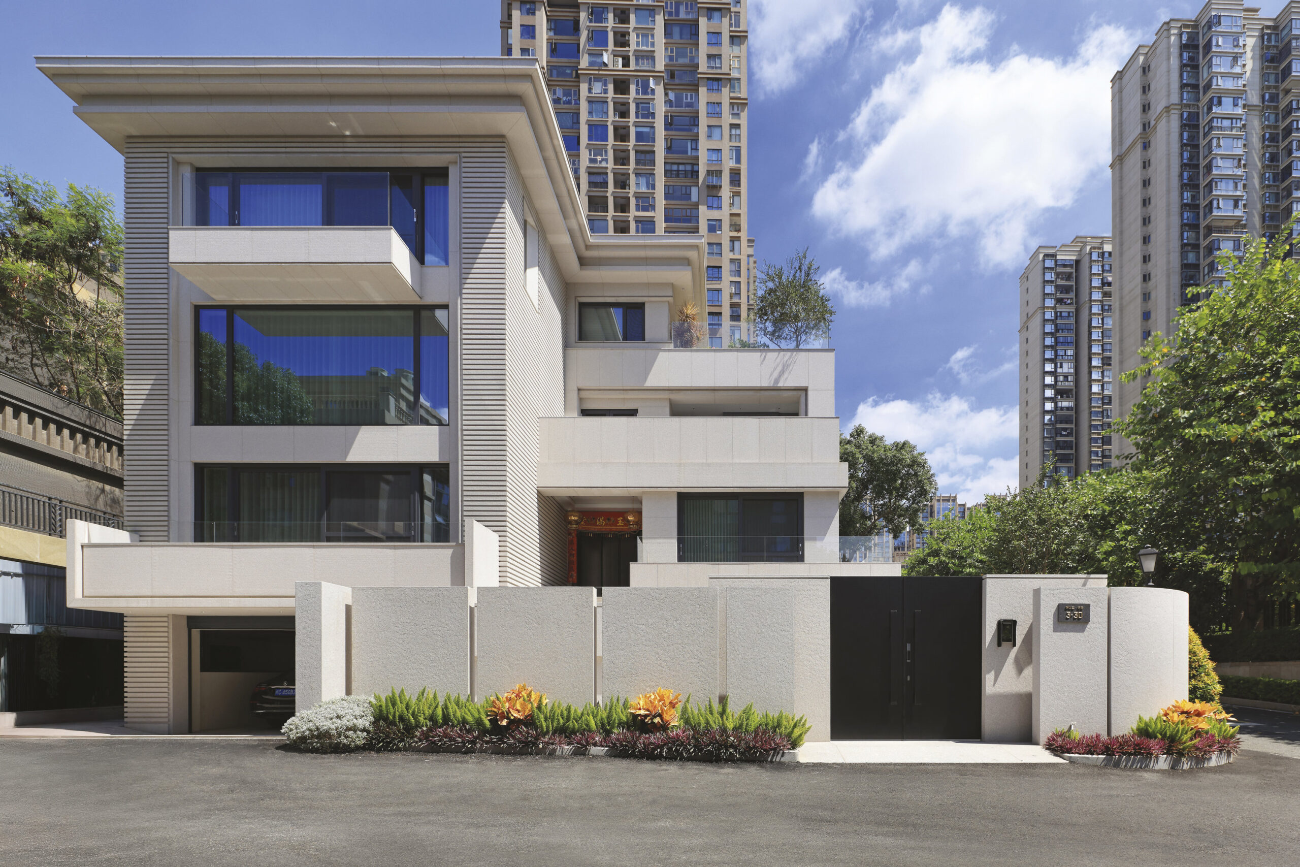 Insérée dans le tissu urbain dense de Quanzhou, cette résidence privée se présente comme une villa compacte recherchant un équilibre entre présence architecturale et introspection domestique. Dans un contexte dominé par des tours résidentielles, le projet développé par Denmo Design affirme une échelle maîtrisée à travers une composition de volumes superposés, de débords profonds et de terrasses en retrait.
