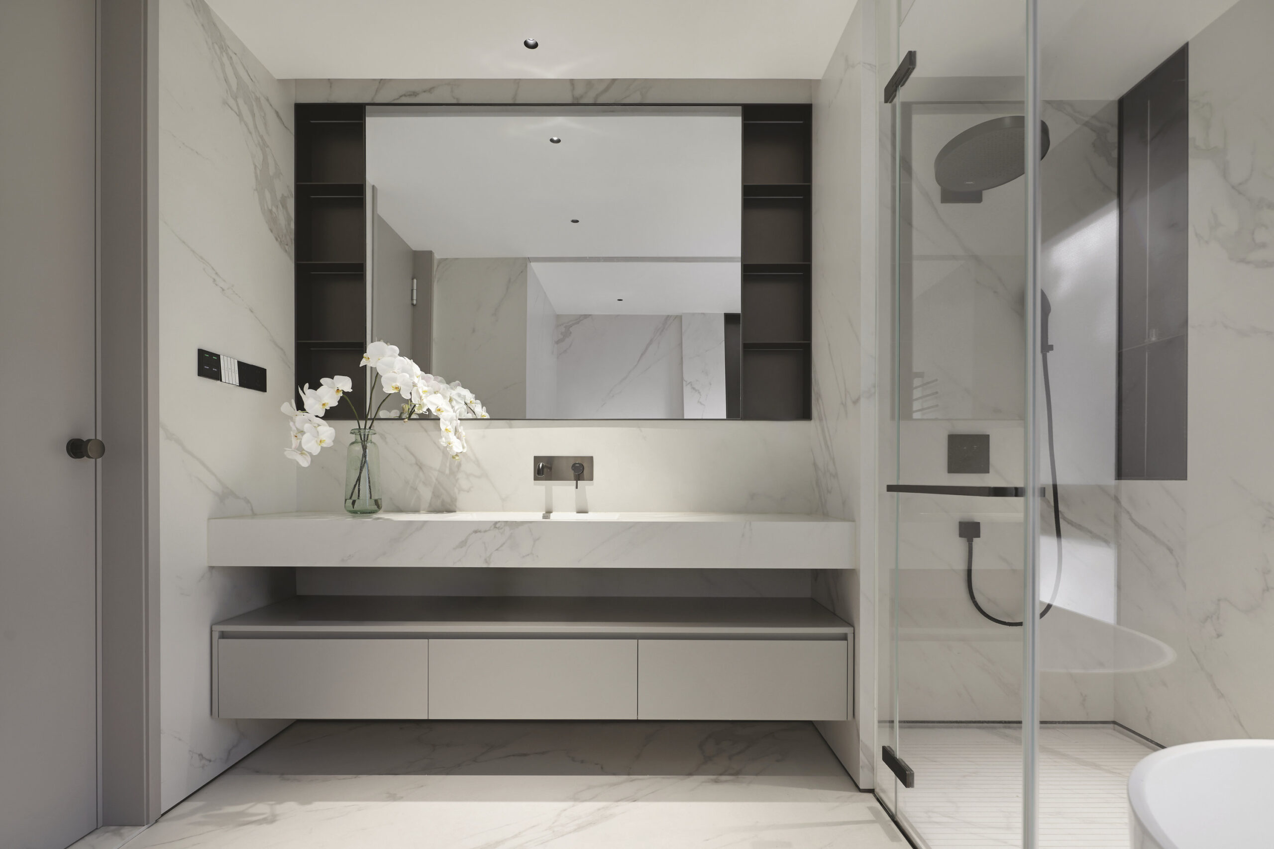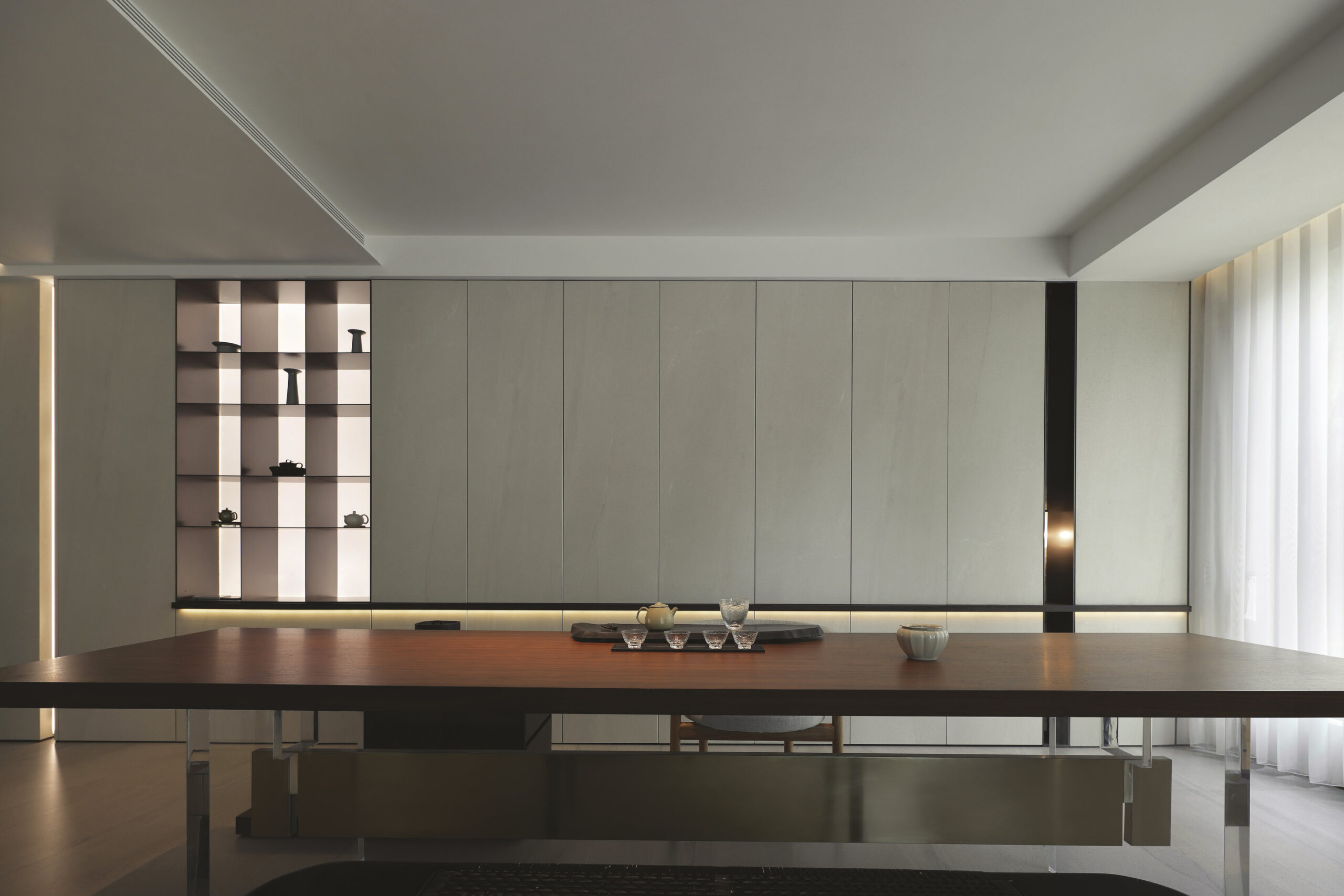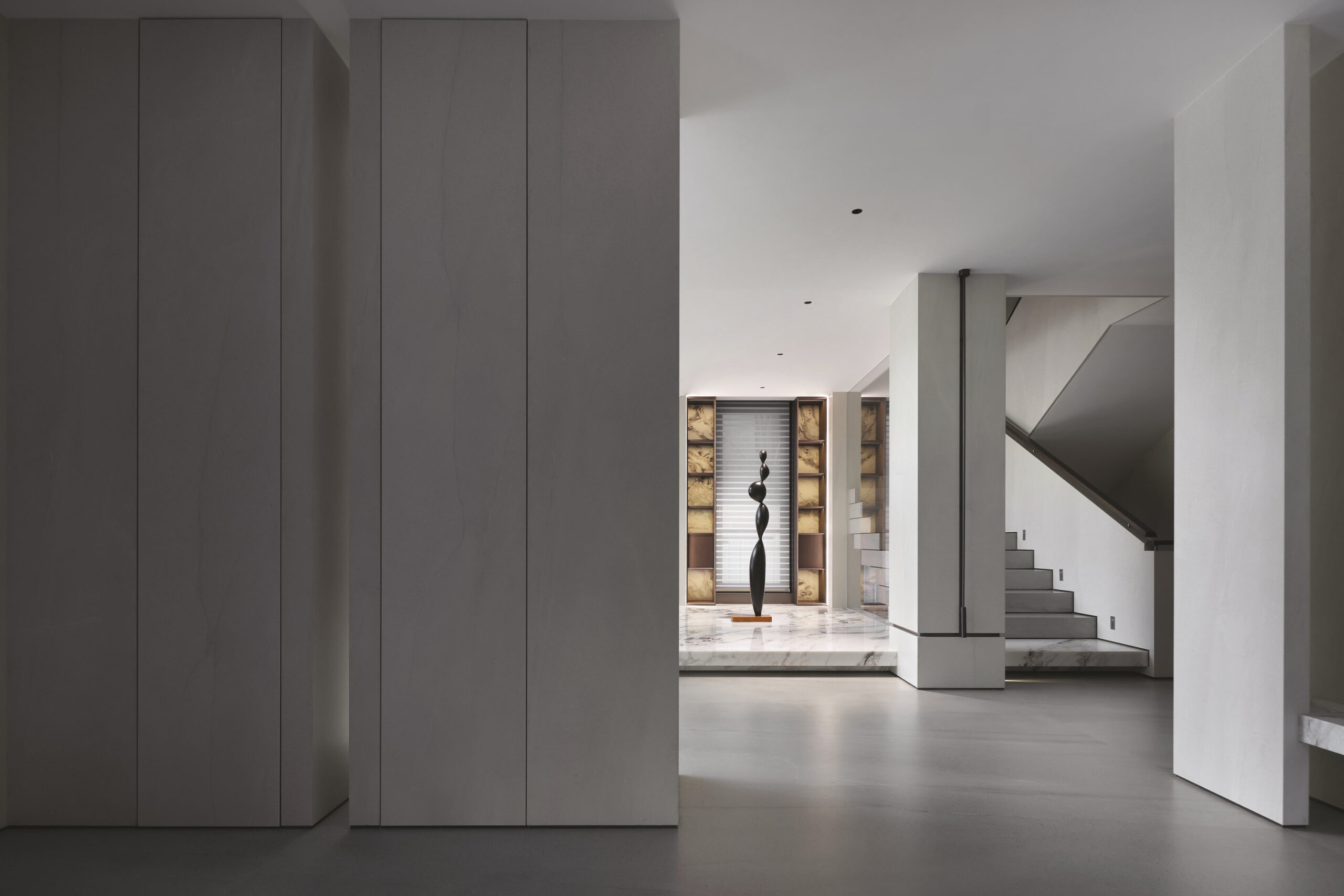 L’utilisation de grandes dalles en grès cérame Maximum constitue un choix déterminant, appliqué aux sols, aux revêtements muraux et au mobilier sur mesure. Le grand format permet des surfaces continues et homogènes, définissant une enveloppe intérieure sophistiquée à texture minérale uniforme.