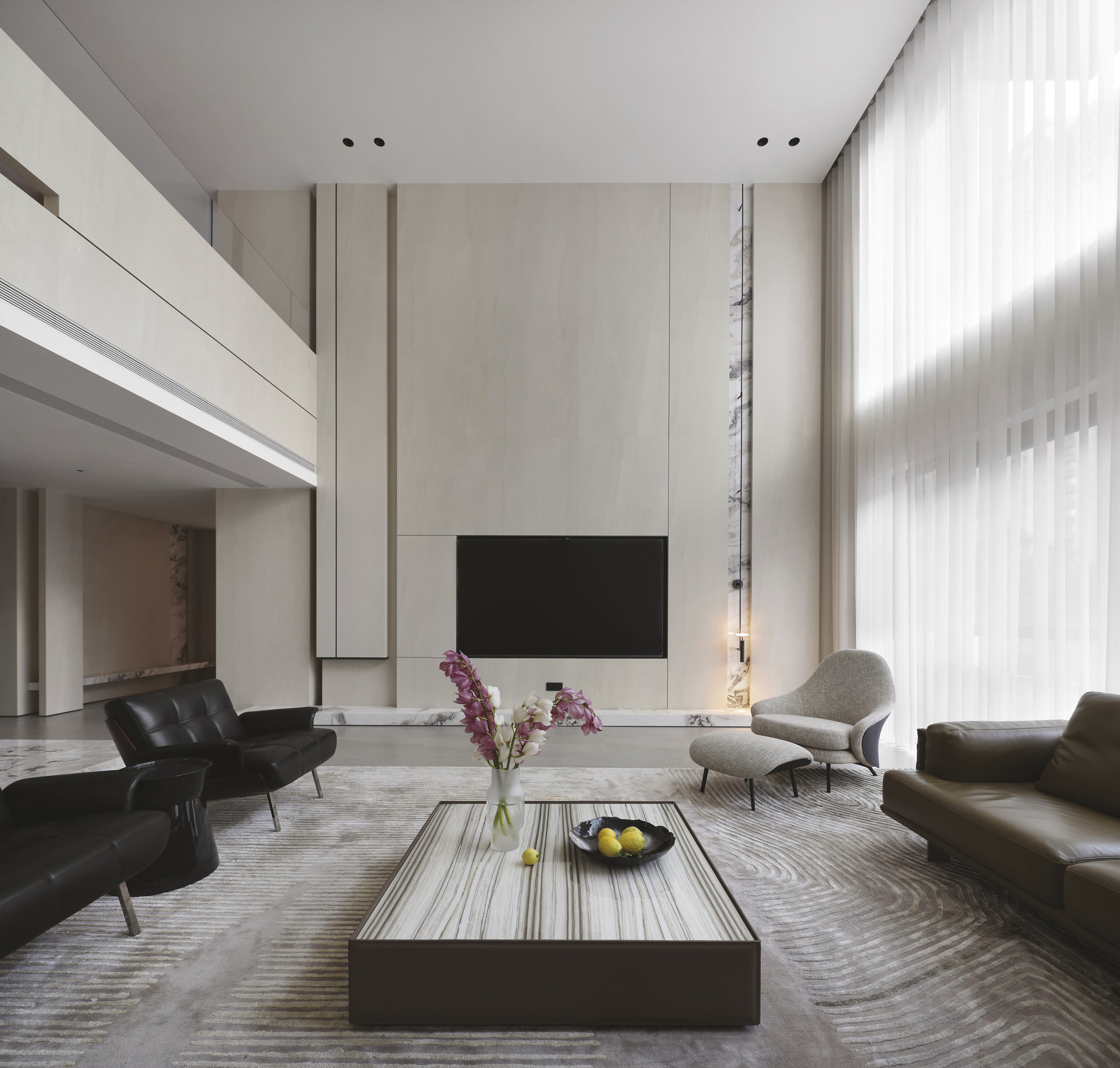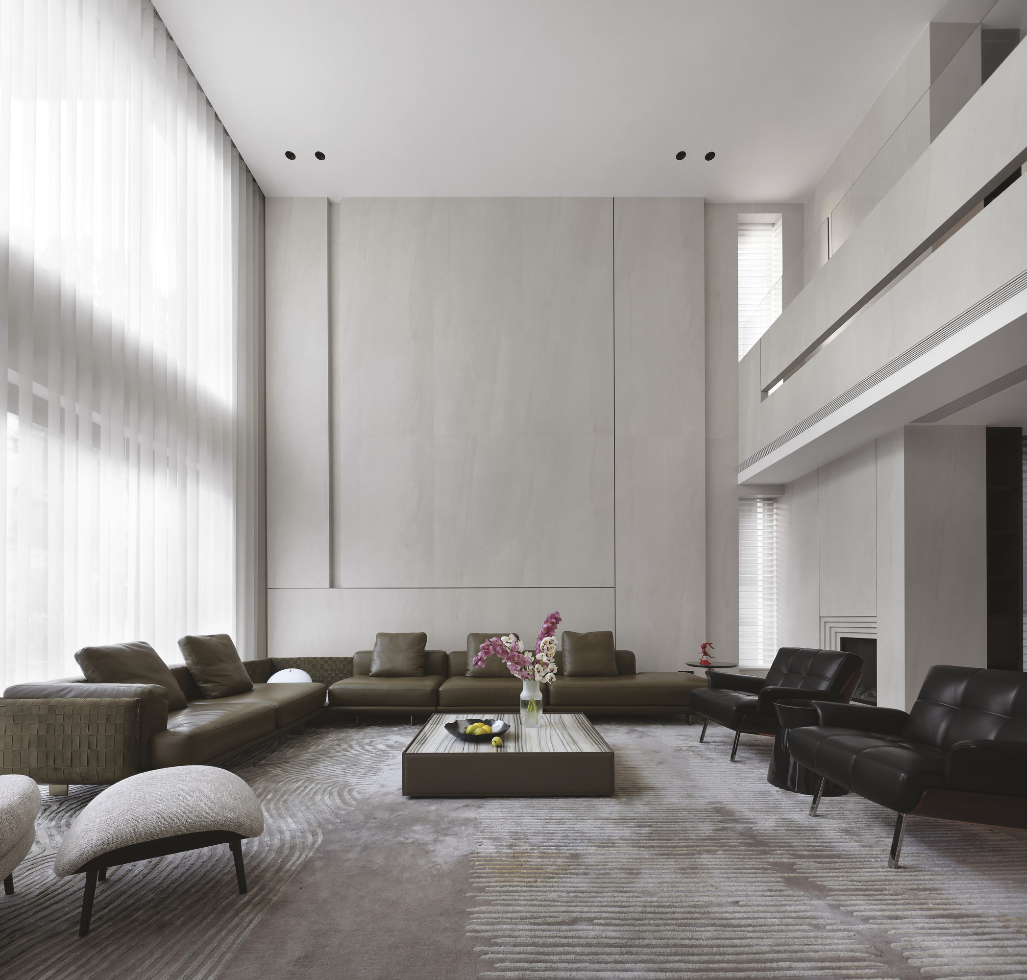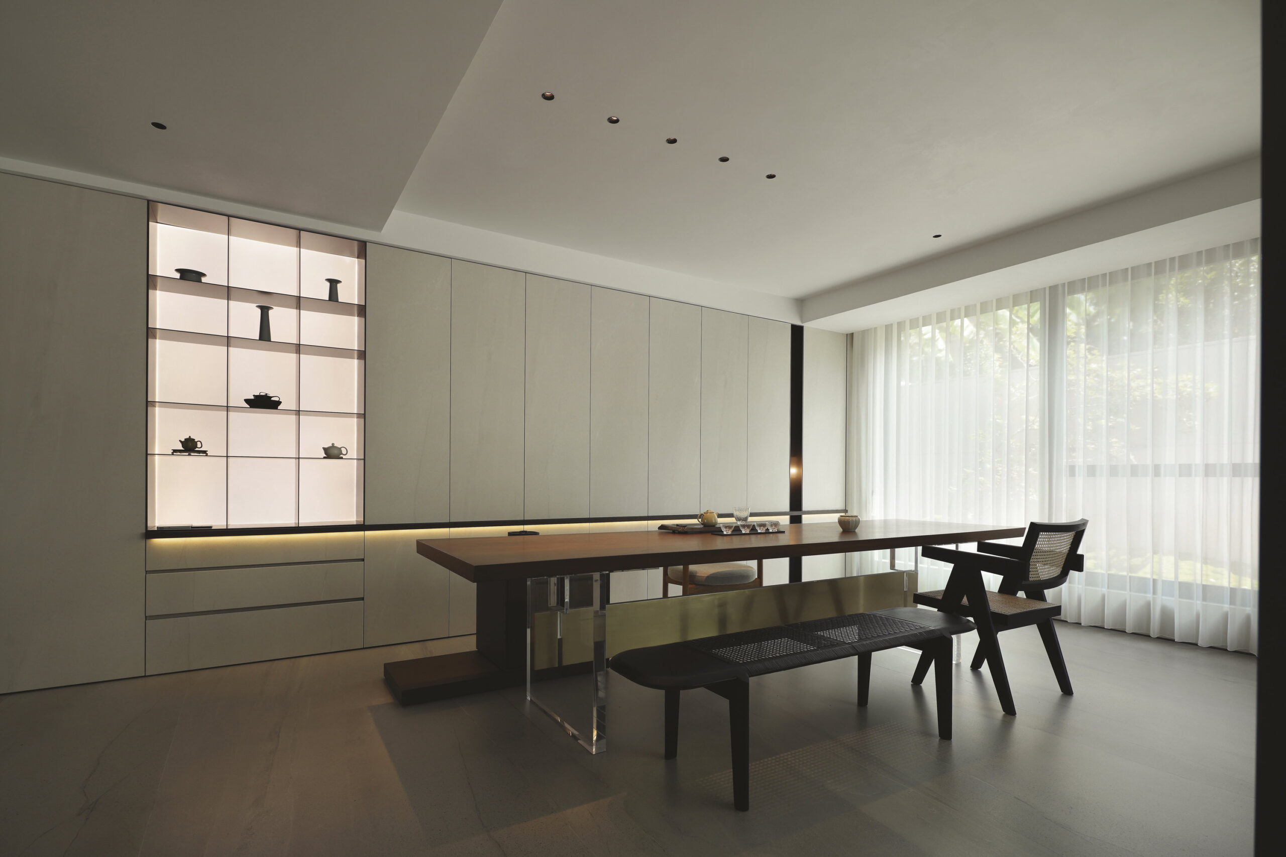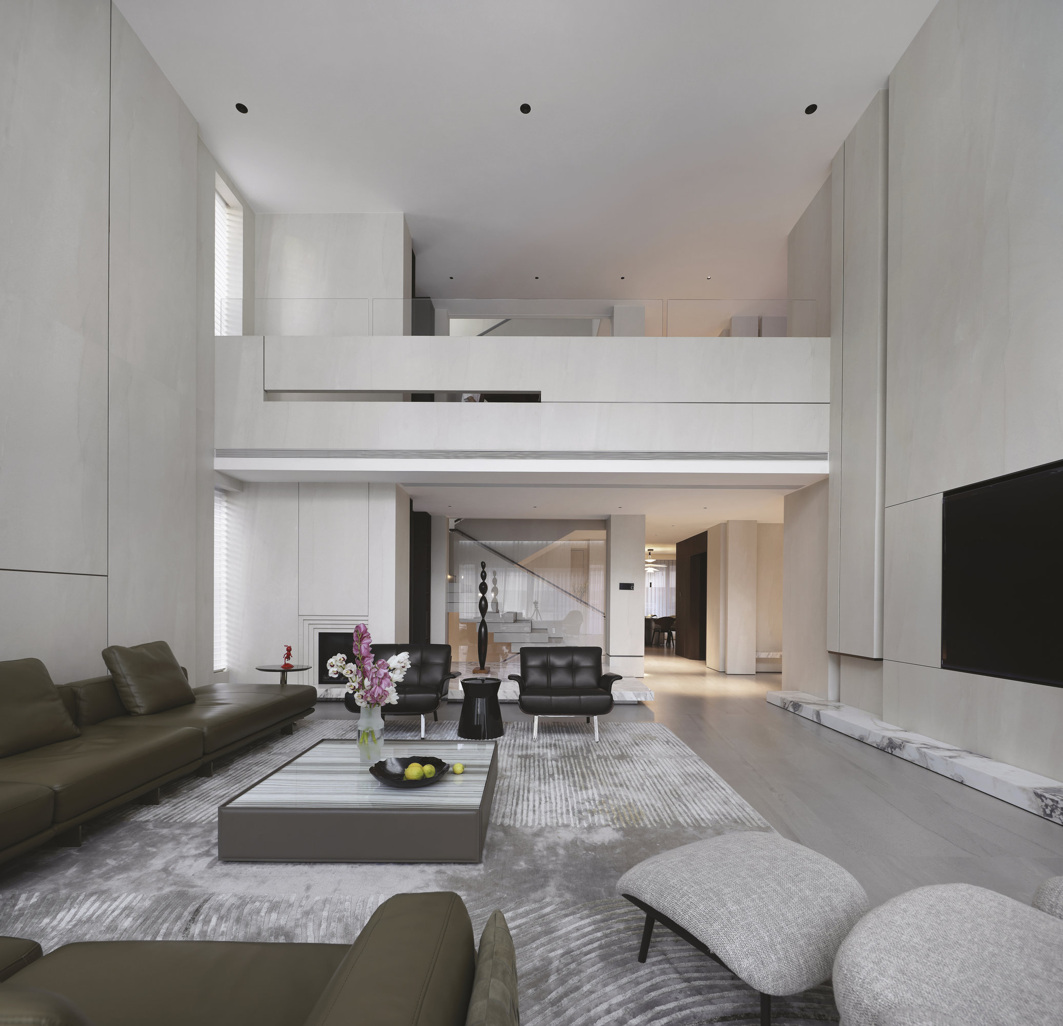 L’utilisation de grandes dalles en grès cérame Maximum constitue un choix déterminant, appliqué aux sols, aux revêtements muraux et au mobilier sur mesure. Le grand format permet des surfaces continues et homogènes, définissant une enveloppe intérieure sophistiquée à texture minérale uniforme.