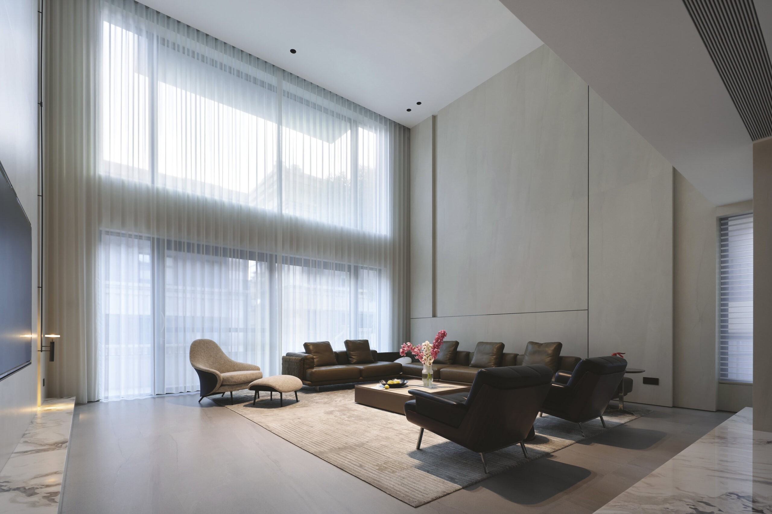La palette – enduits clairs, céramique grand format, bois naturel et métal bruni – crée une atmosphère sobre et silencieuse.
