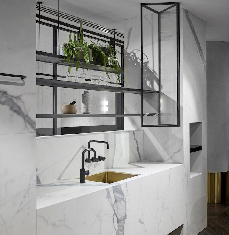 Un élément distinctif est la cuisine sur mesure, conçue et réalisée en collaboration avec Artedomus, et complétée par les surfaces Calacatta Statuario Maximum de Fiandre. Artedomus a supervisé chaque détail du design et de la fabrication du mobilier, assurant fonctionnalité et harmonie esthétique, tandis que les dalles Fiandre apportent élégance, durabilité et une surface visuellement raffinée, parfaitement intégrée au style sophistiqué du lounge.